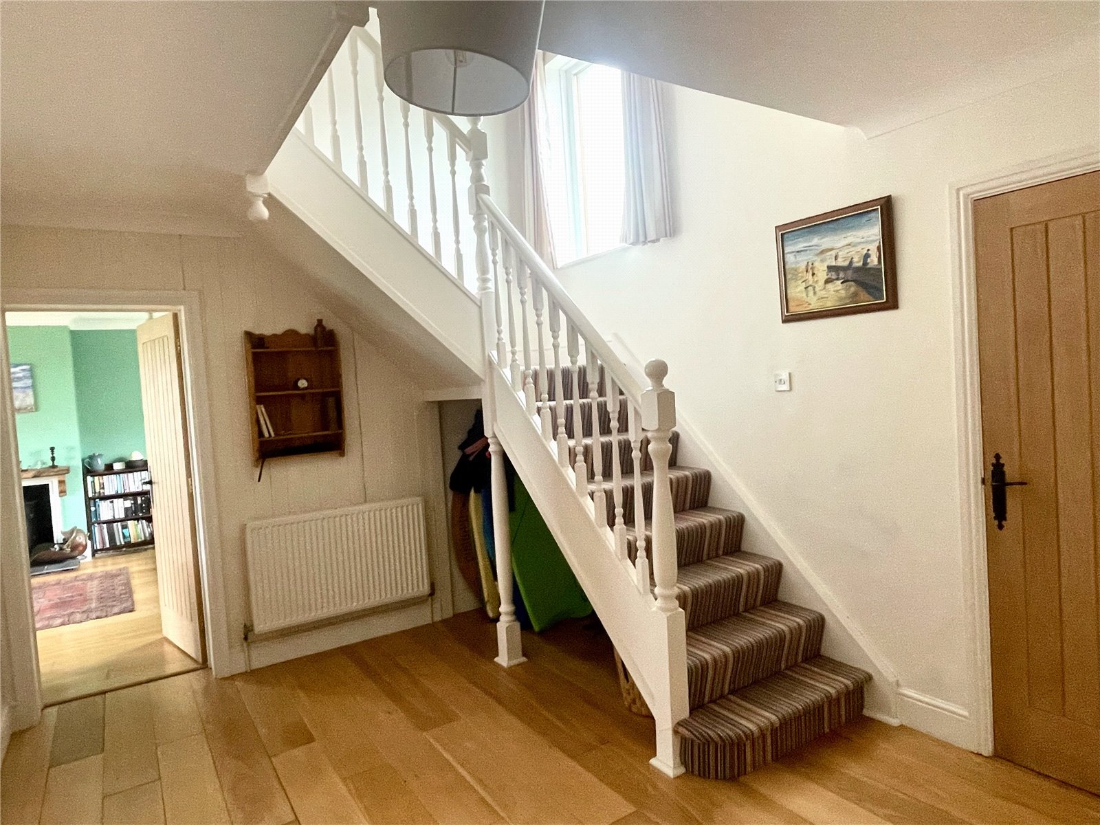 Wooden flooring, radiator, stairs to first floor, ceiling light.