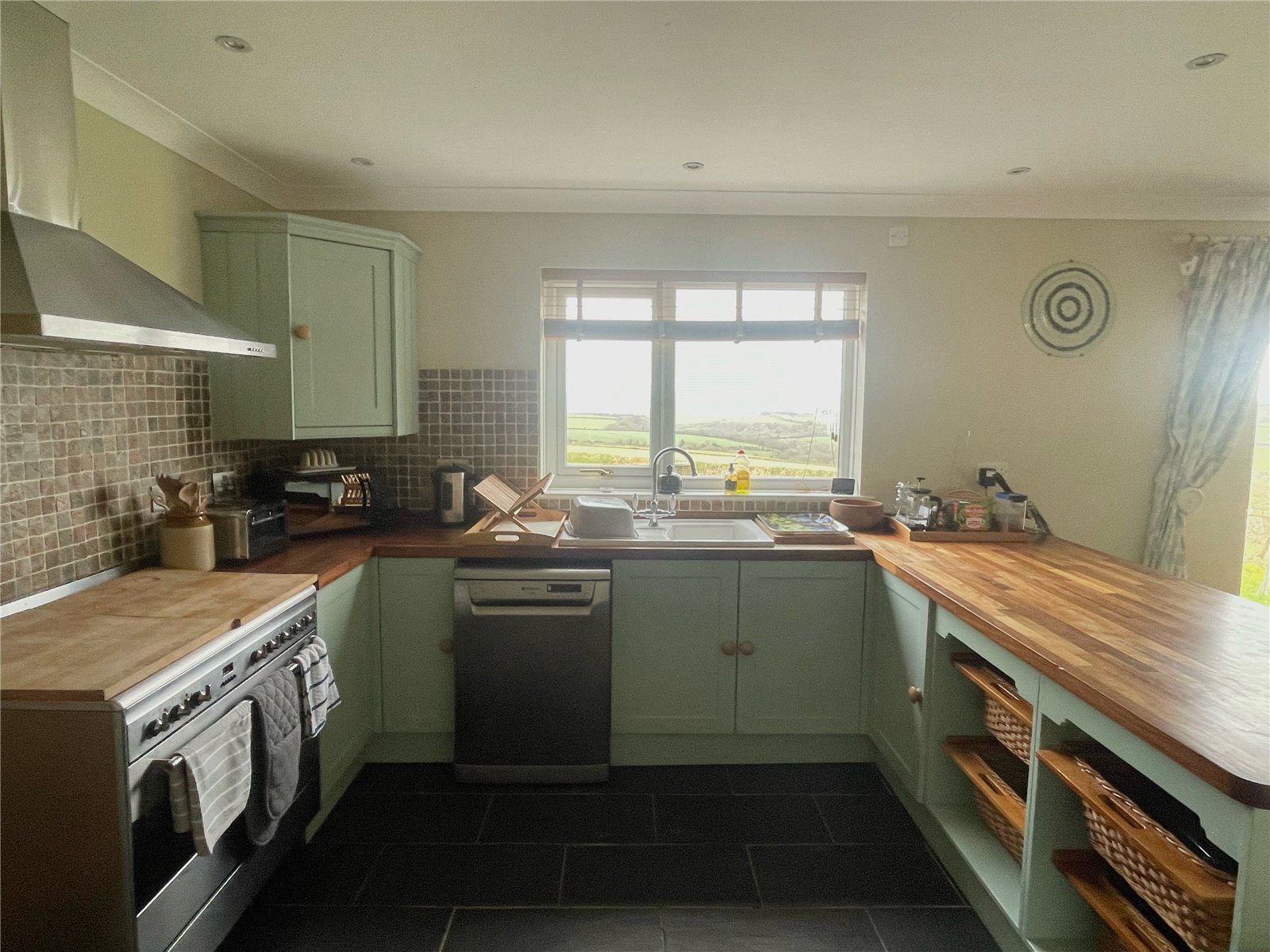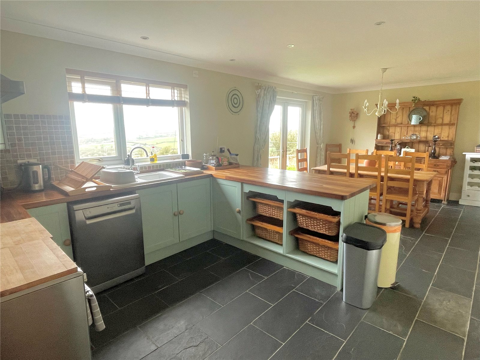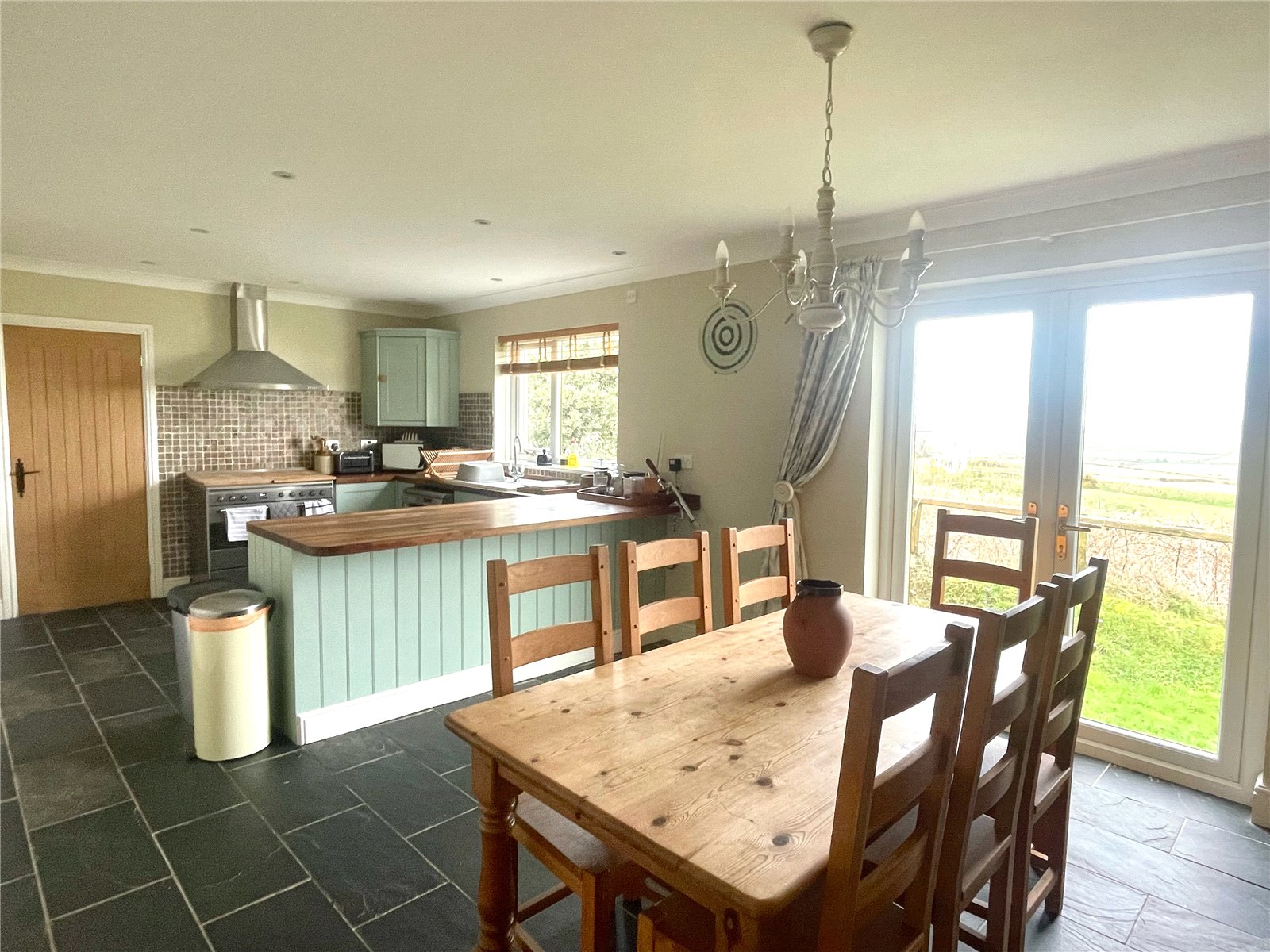 Slate floor, a range of base and wall units with wooden work top. Ceramic sink and drainer with mixer tap, uPVC double glazed window and French doors leading to patio, with sea and countryside views. Cooker with electric hob and overhead extractor and light, 2 x radiators, spotlights over kitchen, ceiling light over dining table. Oak door to: