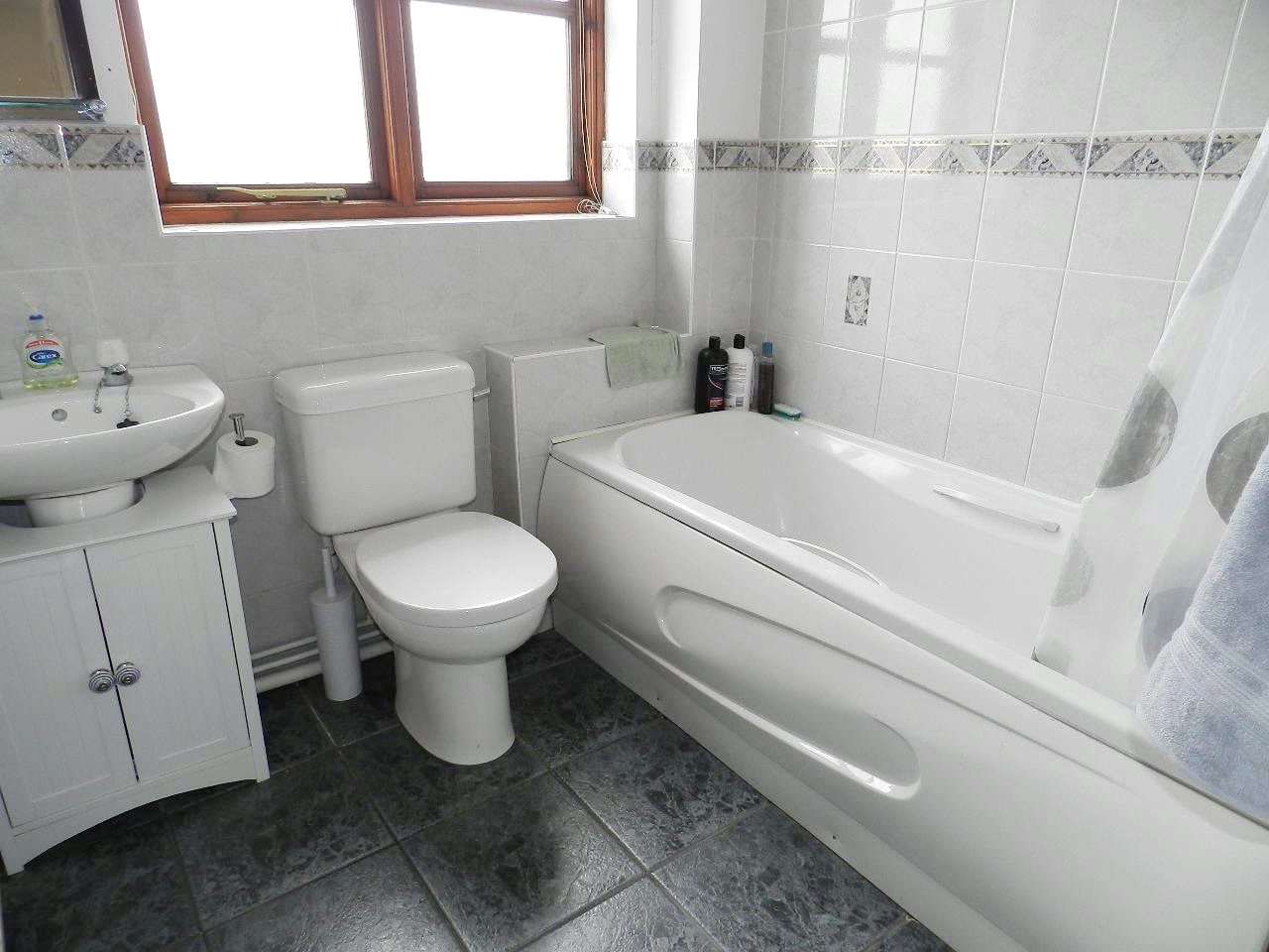 Wooden double glazed window to rear, tiled flooring and walls, panelled bath with electric shower over, WC, pedestal wash hand basin, radiator, extractor fan, mirrored cabinet, textured ceiling.