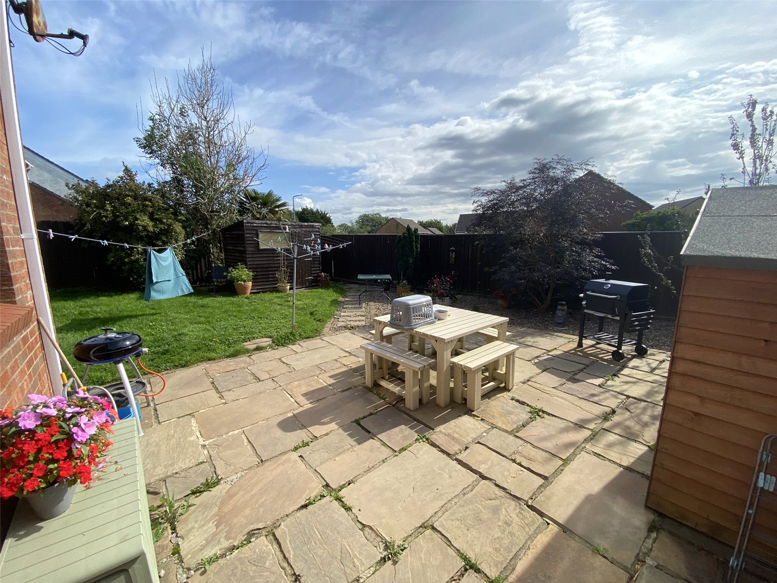 Tarmac driveway for three cars leading to further gravelled area/driveway, lawned gardens leading down the side of the property to the rear, slabbed patio area and garden shed.