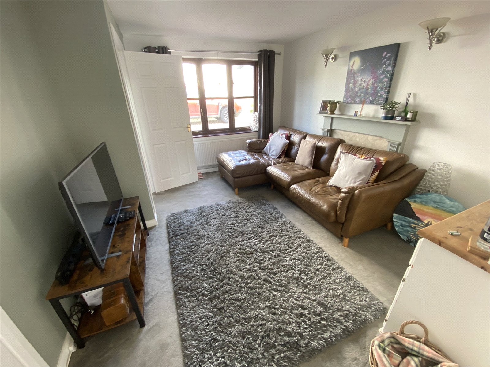 Wooden double glazed window to fore, built in under stairs storage cupboard, electric fireplace with wooden surround and marble hearth, radiator, TV point, door to: