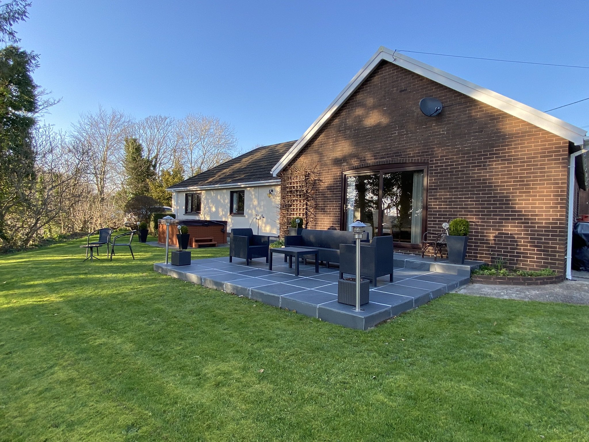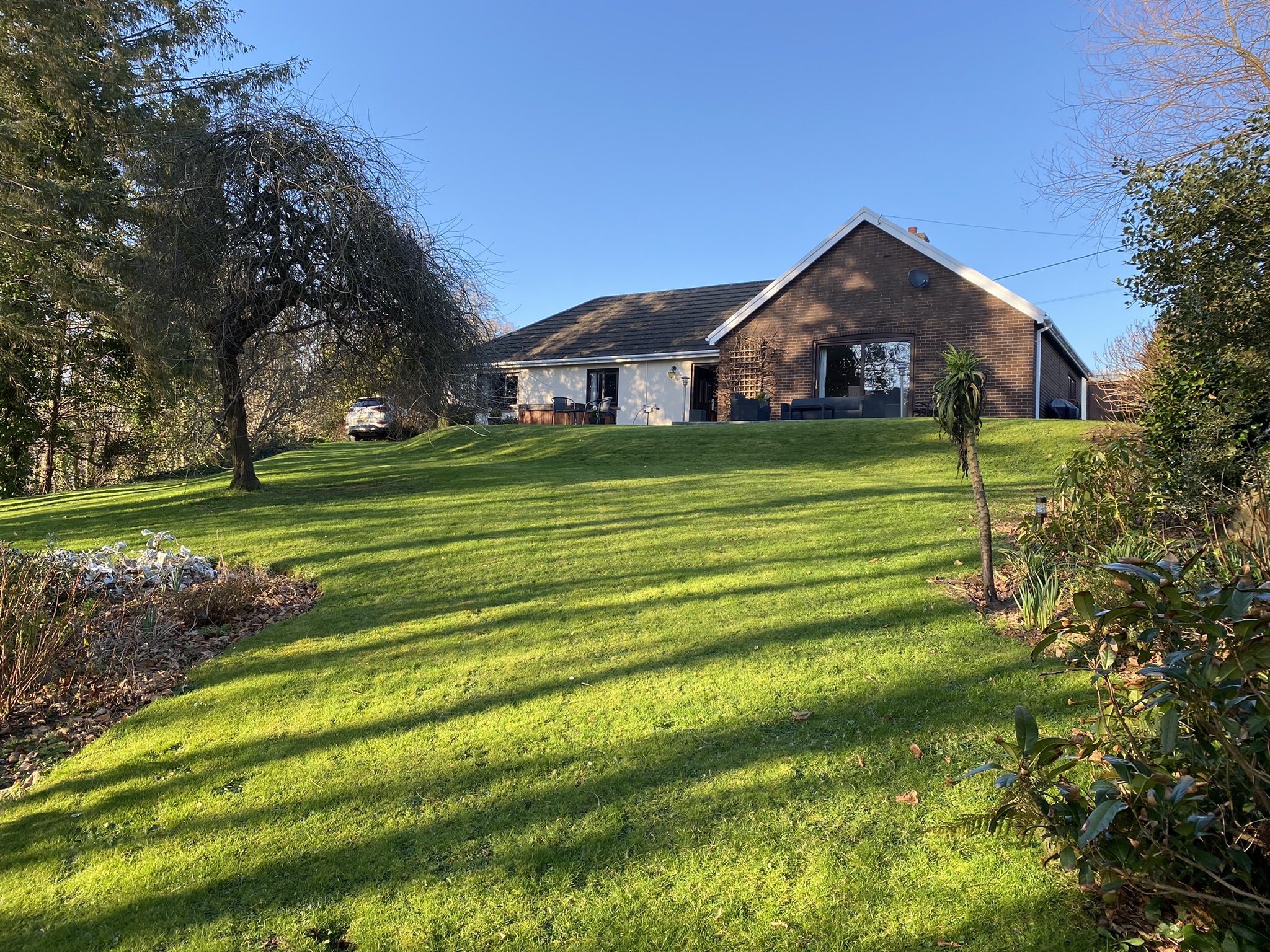 Externally to the front the property benefits from its own private lane and steers off onto the driveway which can comfortably accommodate 8 + vehicles. There is a well presented lawned front Garden where you can find the Greenhouse and Storage shed and access from all sides onto the beautiful rear Garden. This large grassed Garden boasts shrubs and plants plus the most fantastic Patio area directly overlooking the view. There are outside power points and lighting plus a water tap for those who might like to consider having a hot tub where a base is already in place.