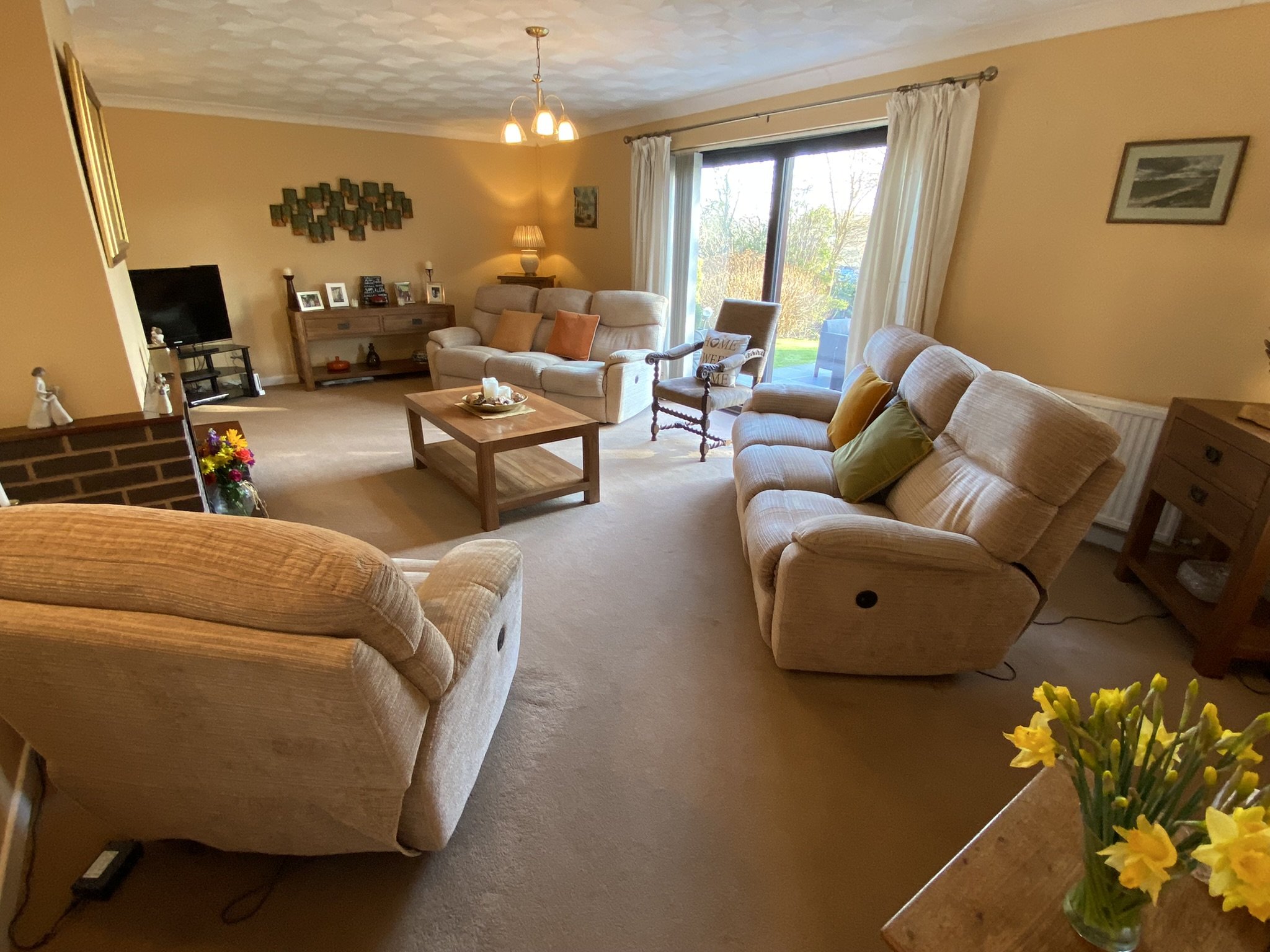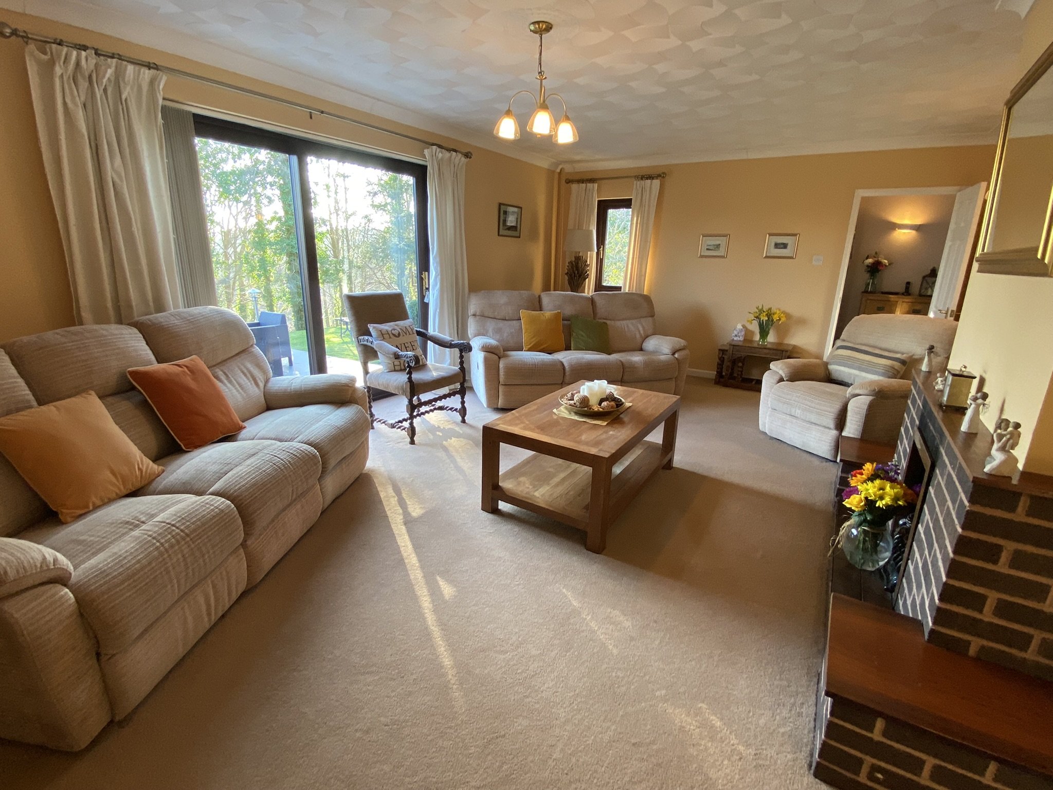 Large Lounge with sliding patio doors out onto the patio area. Gas fire plus radiators and carpeted flooring.