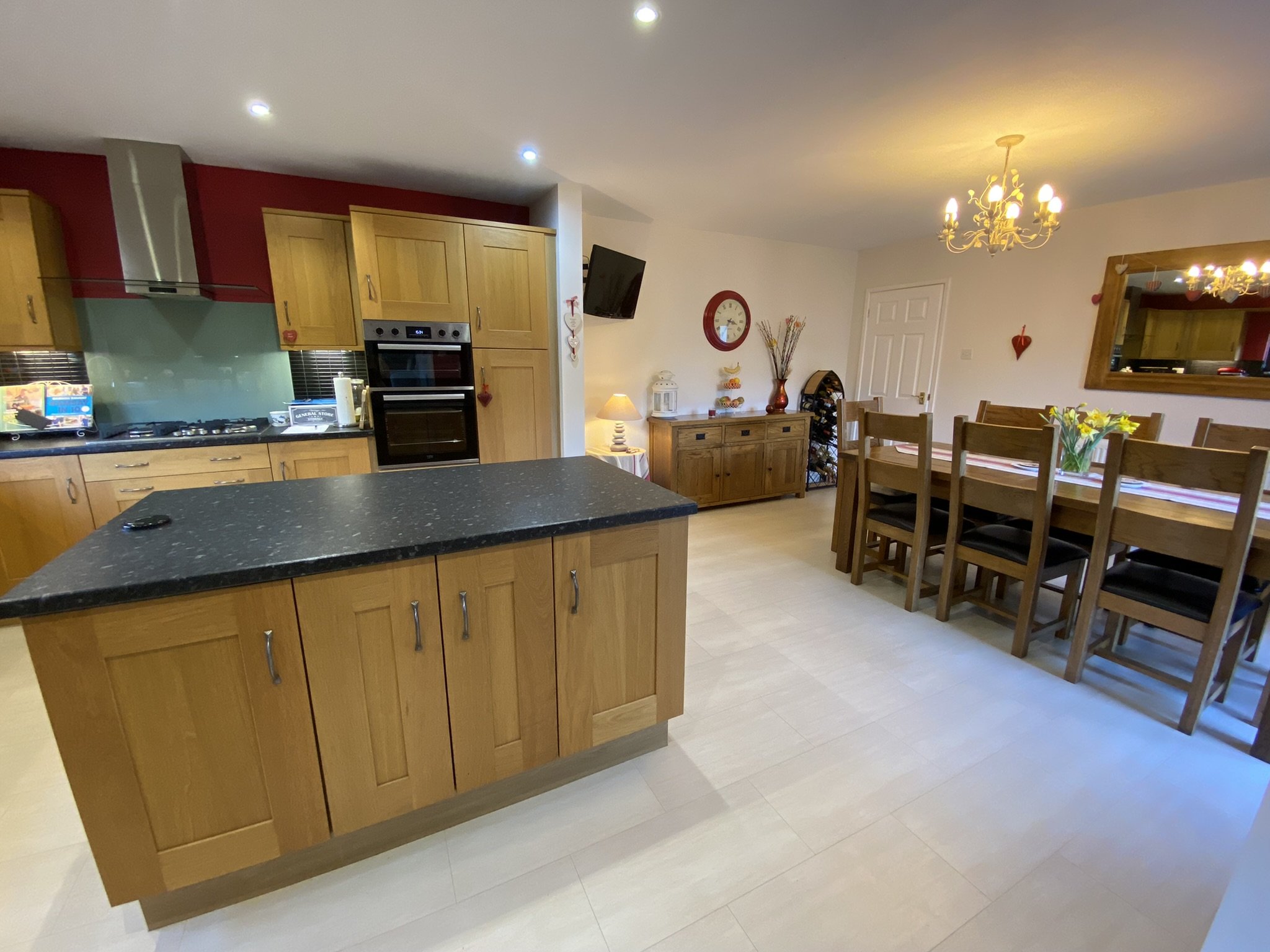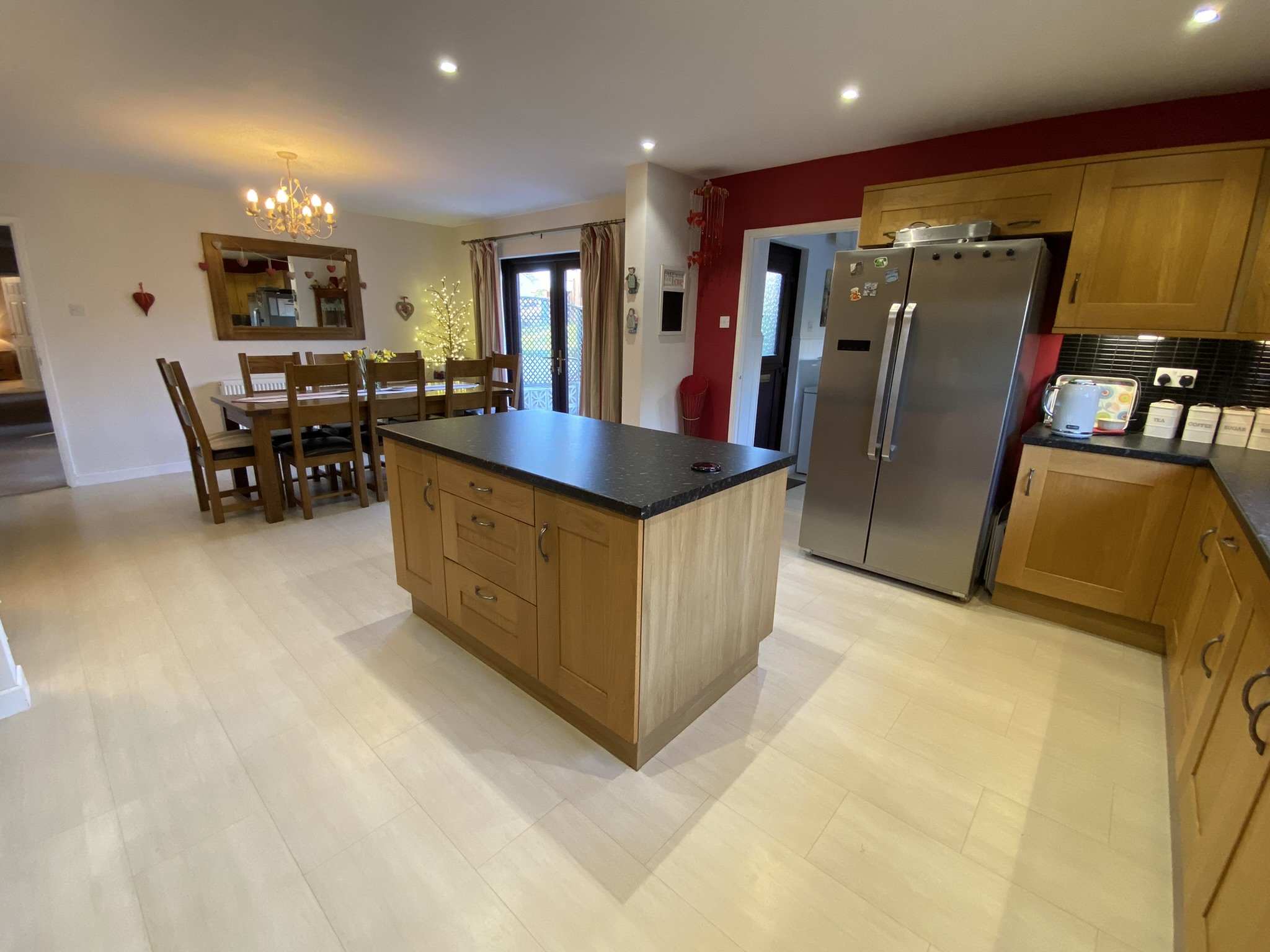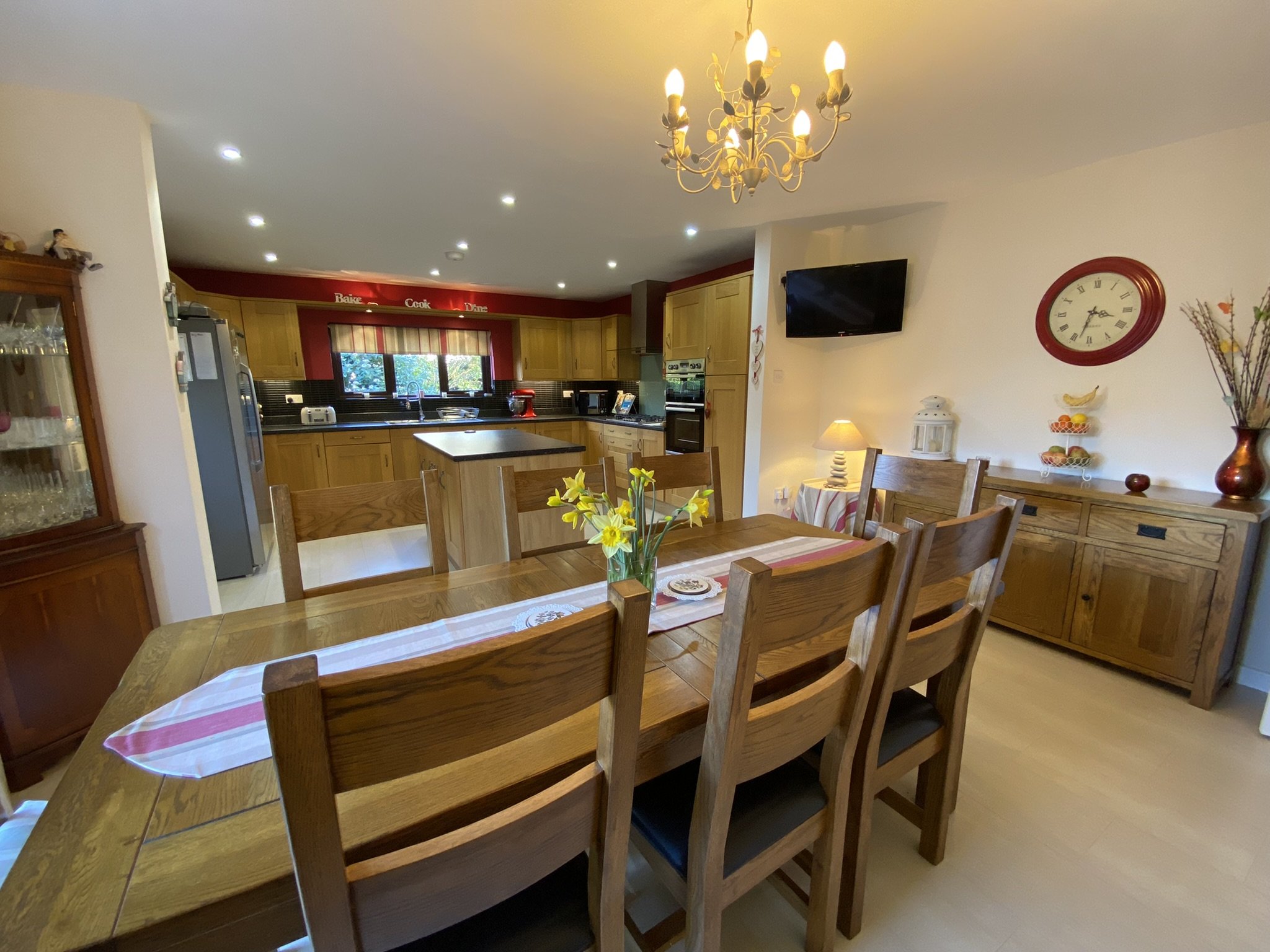 Large open plan Kitchen / Dining Room. French doors onto external patio area with room for a large family sized dining table and chairs. Kitchen boasts an island plus a large range of wall and base units. Integral appliances include dishwasher, 5 ring gas hob fired by Lpg calor gas cylinder. Eye level oven and grill plus space for freestanding appliances. Double glazed window to the size and access into the Utility area.