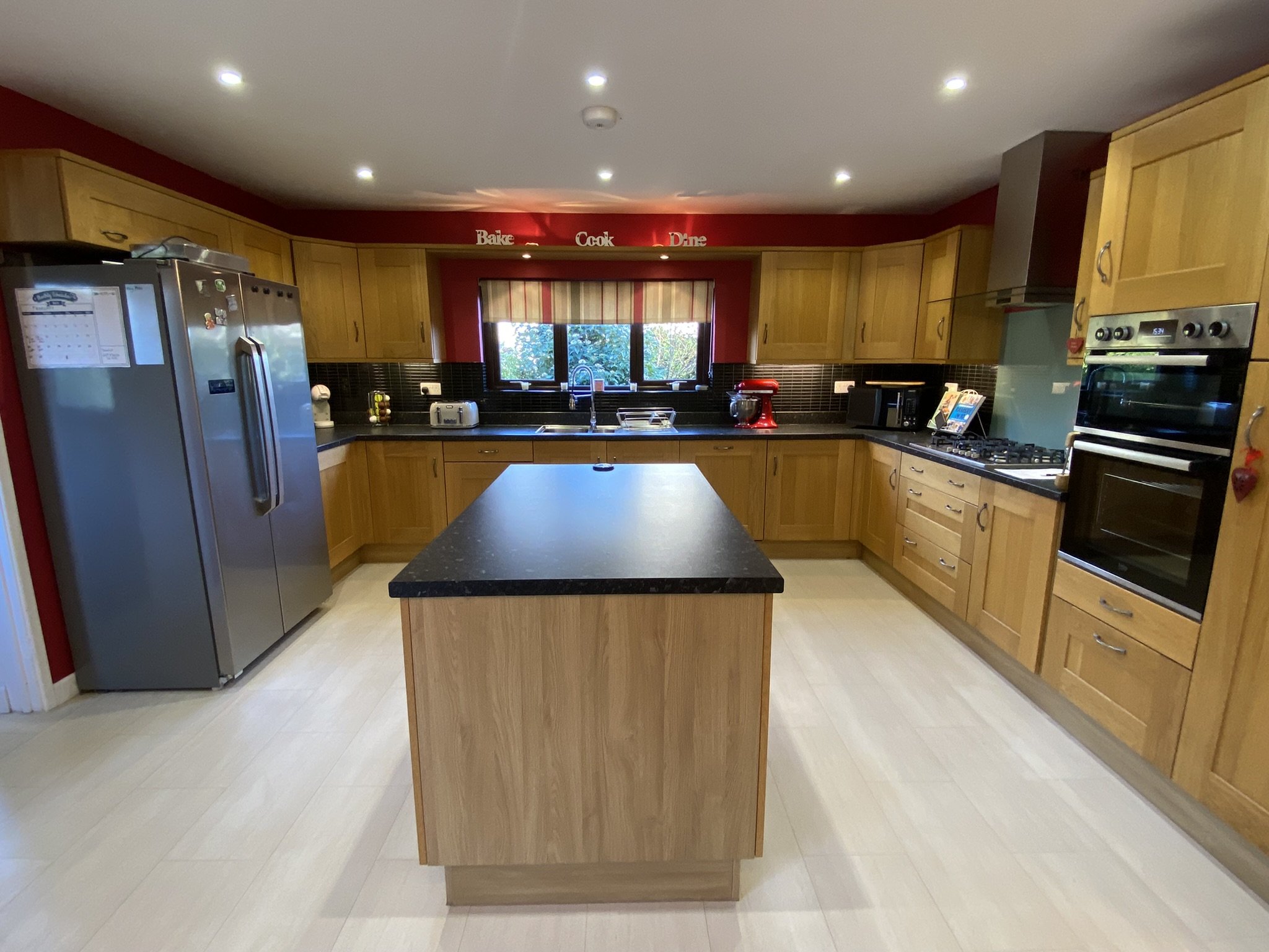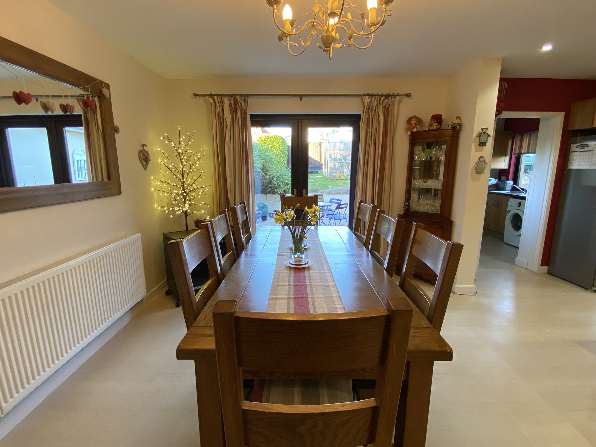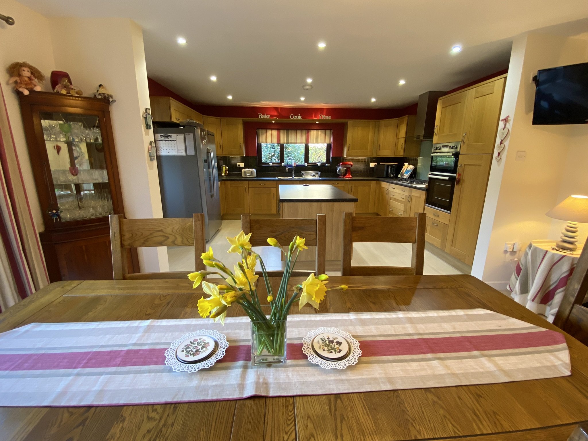 Large open plan Kitchen / Dining Room. French doors onto external patio area with room for a large family sized dining table and chairs. Kitchen boasts an island plus a large range of wall and base units. Integral appliances include dishwasher, 5 ring gas hob fired by Lpg calor gas cylinder. Eye level oven and grill plus space for freestanding appliances. Double glazed window to the size and access into the Utility area.