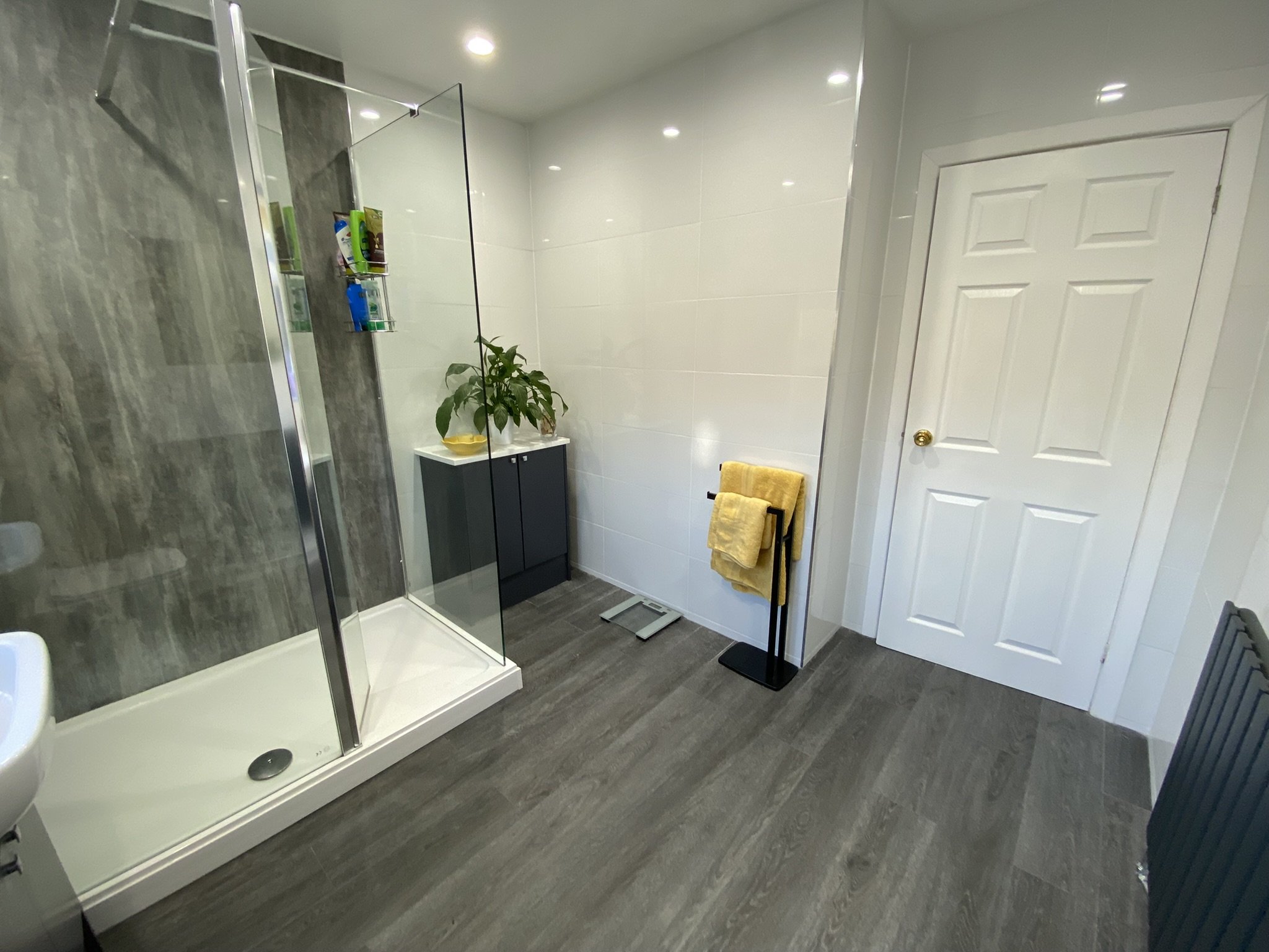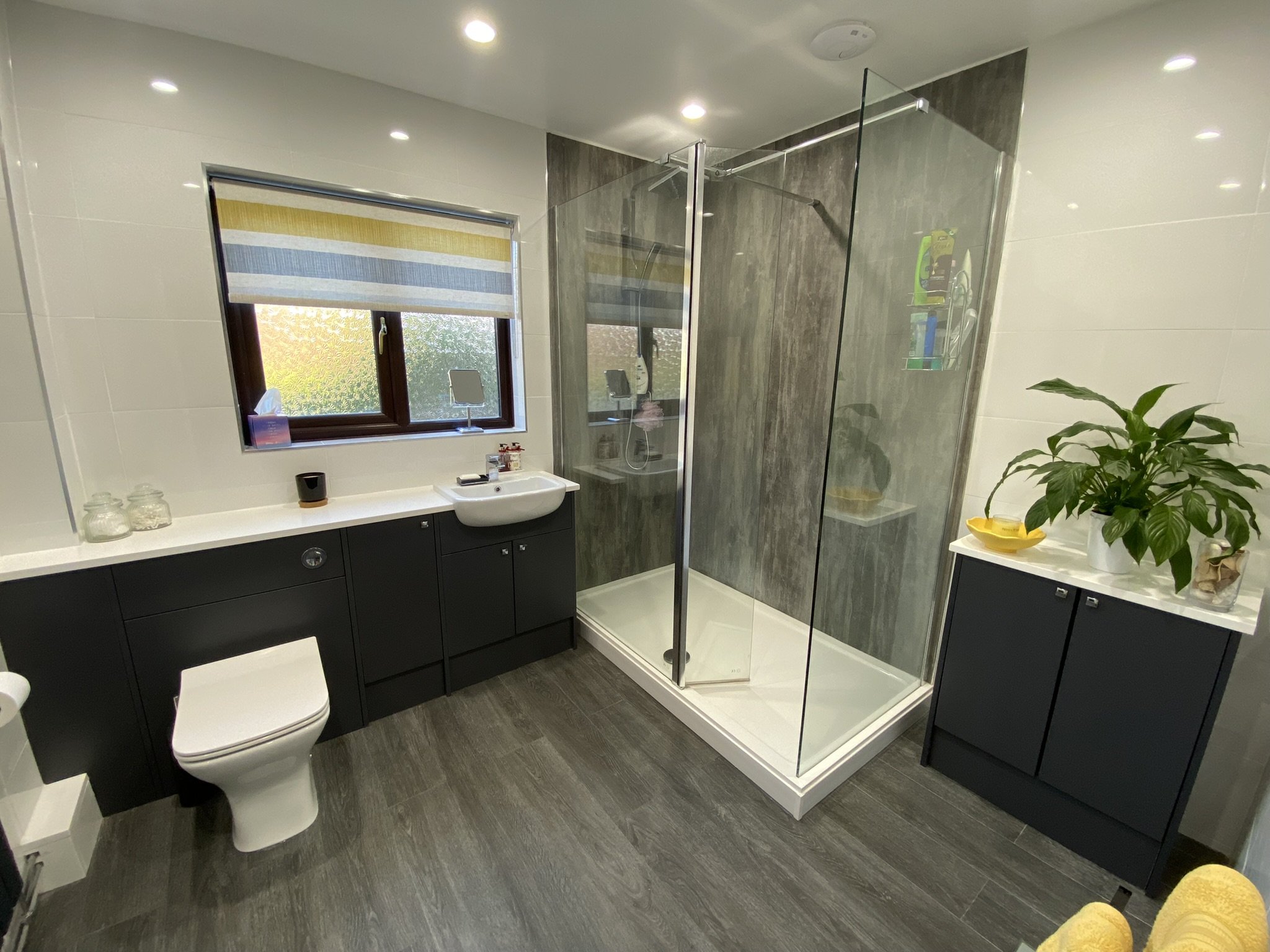 Beautiful Bathroom replaced in 2021. There is a large walk in double shower with feature shower wall panels plus a range of built in vanity units with a built in wash hand basin and w.c. There are spotlights in the ceiling and an obscured double glazed window to the rear.