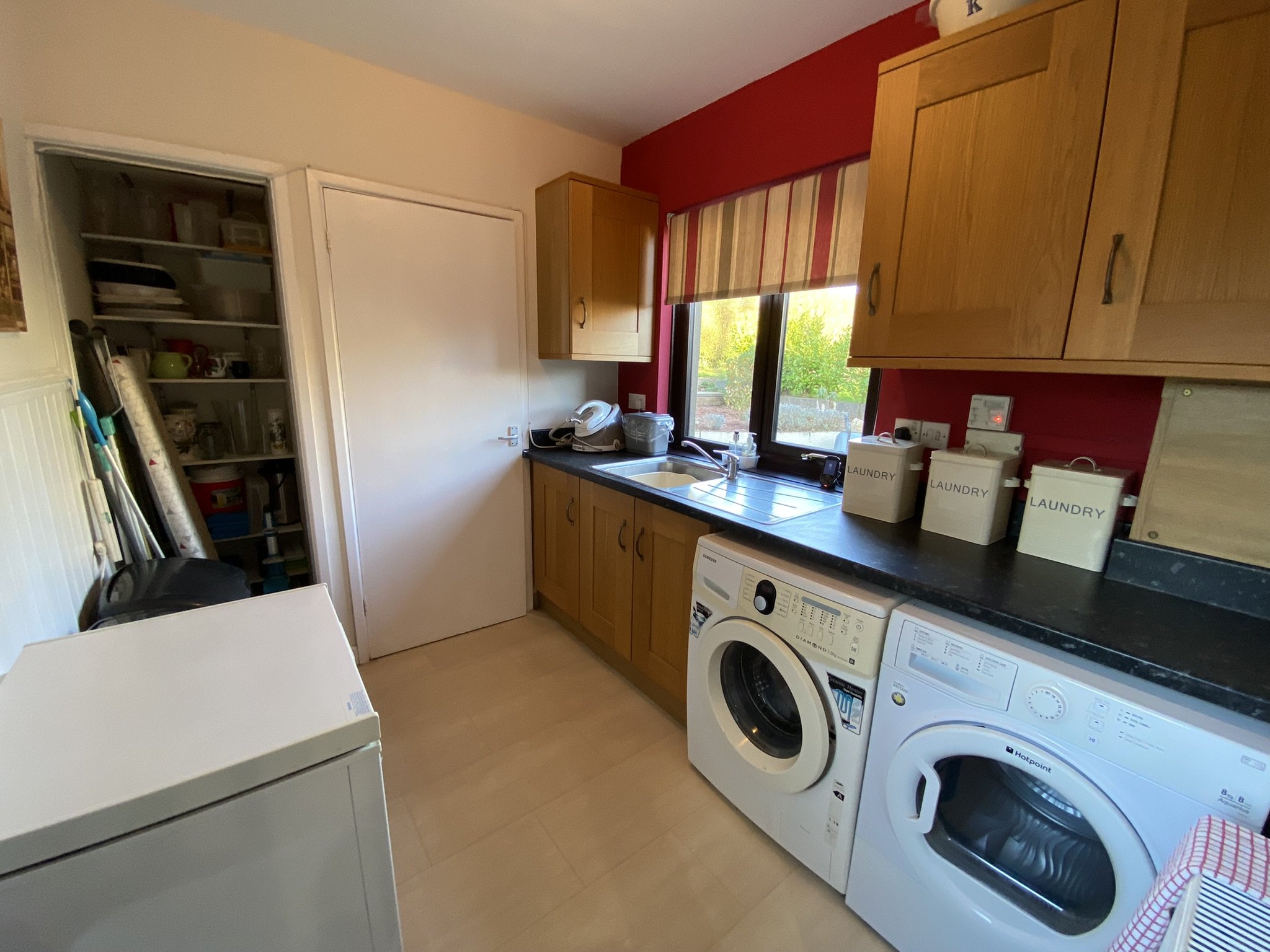 Further worktop and storage cupboards with a second sink unit. Space and plumbing for free standing appliances plus a large walk in larder for storage and the uPVC double glazed external stable door.