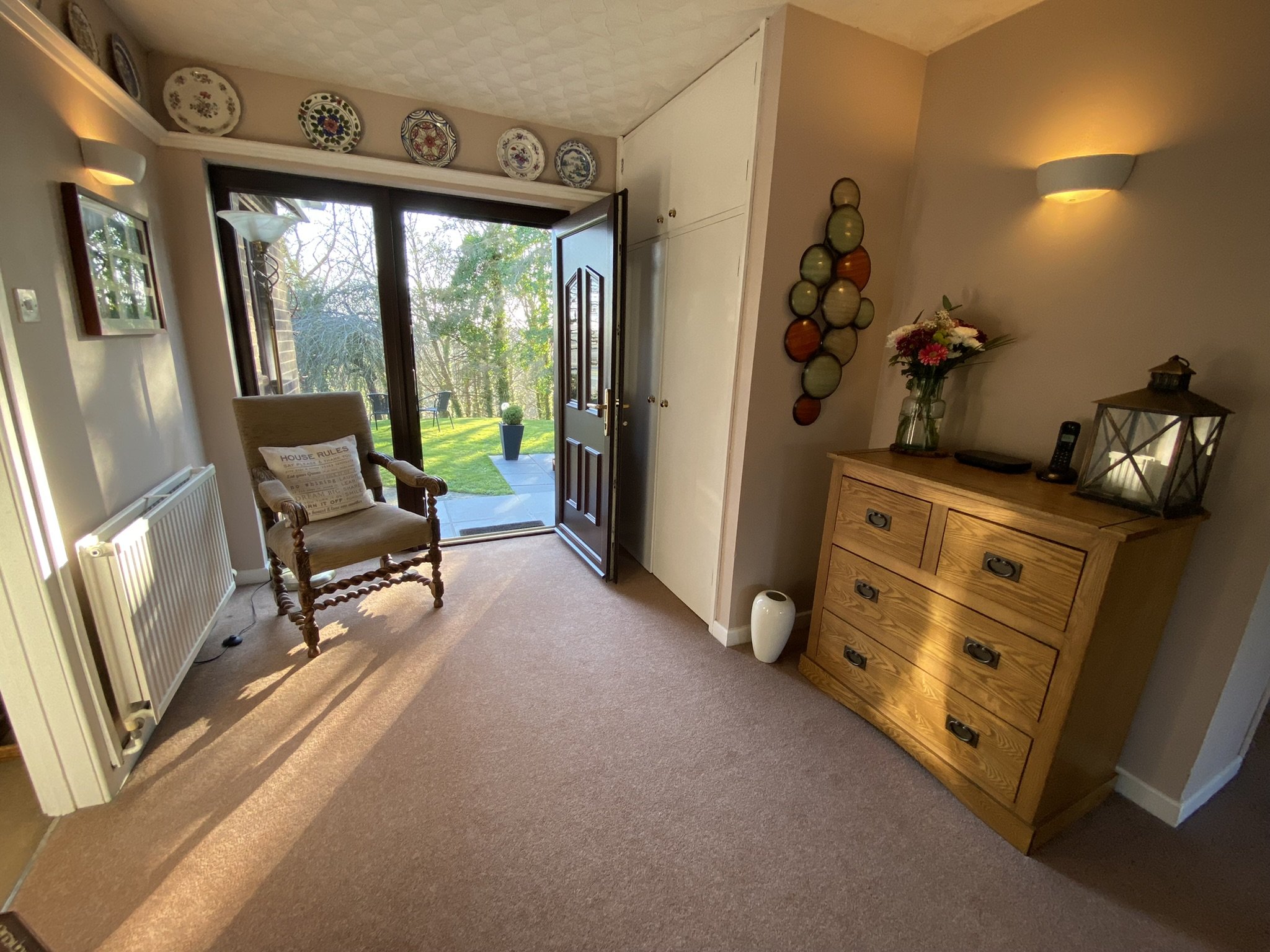 Large welcoming Entrance Hallway with two large built in storage cupboards with one featuring a radiator and currently utilised as the airing cupboard.