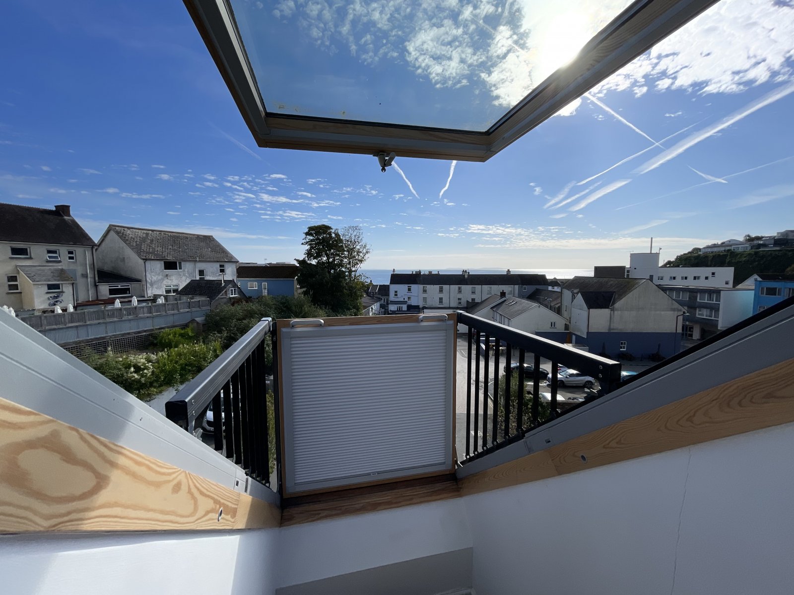 The Master Suite. Fitted set of wardrobes with mirrored façade, from the Waterstone designer home range. Walk-in storage closet. Fold-out balcony system Velux window, which is cleverly designed to smoothly transform from a Velux window to a protruding balcony in seconds. This affords stunning views towards the coastline and Monkstone Point. Solid Oak door to the master en-suite.