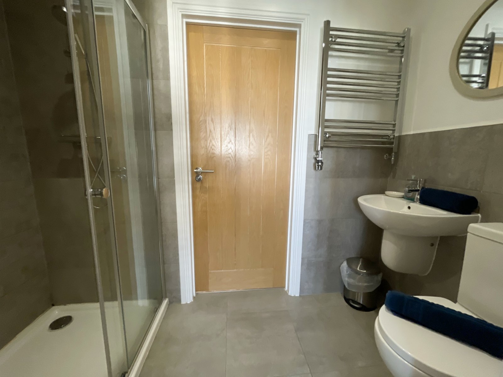 Jack and jill en-suite Fitted with porcelain wash hand basin, WC and double length walk-in shower with multi-head attachments including waterfall and standard. Porcelanosa ceramic tiled floor and part tiled walls. Chrome heated towel rail.