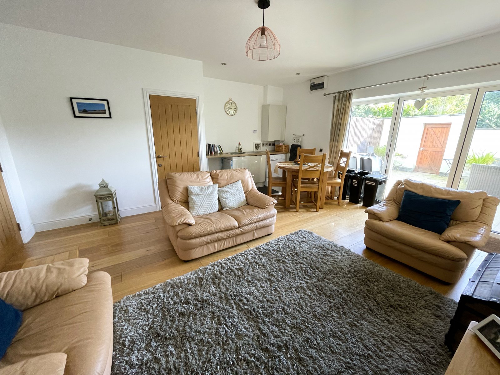 Open plan living space. Solid Oak internal door with stairs to lower ground floor. Bi-fold aluminium doors opening out onto the decked balcony.