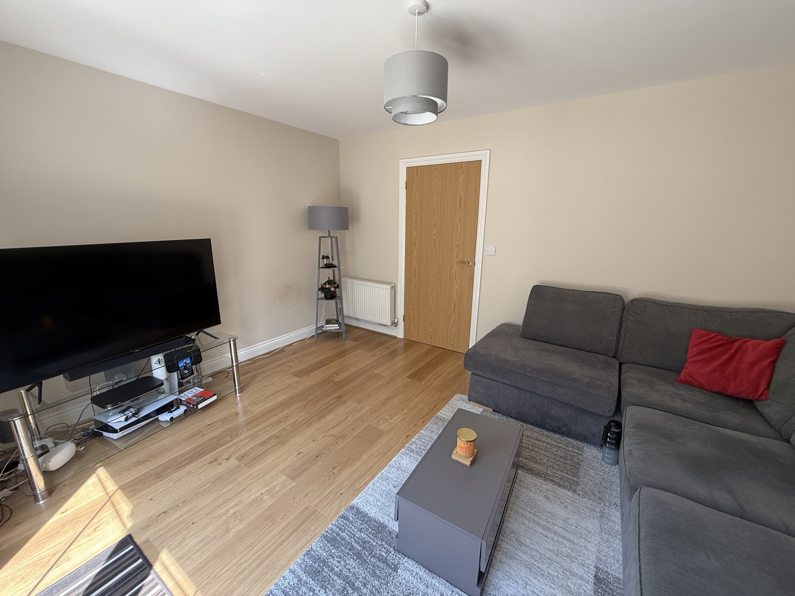 Laminate flooring, radiator, double glazed window and door to front of property, light fitting and stairs leading to...