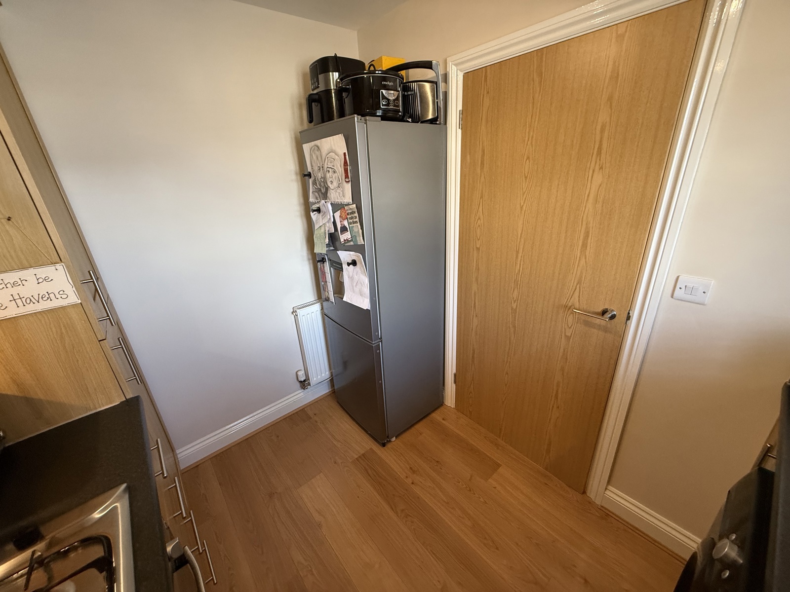 Laminate flooring, radiator, light fitting, intergrated oven with gas hob, laminate flooring, double glazed window to the front of the property.