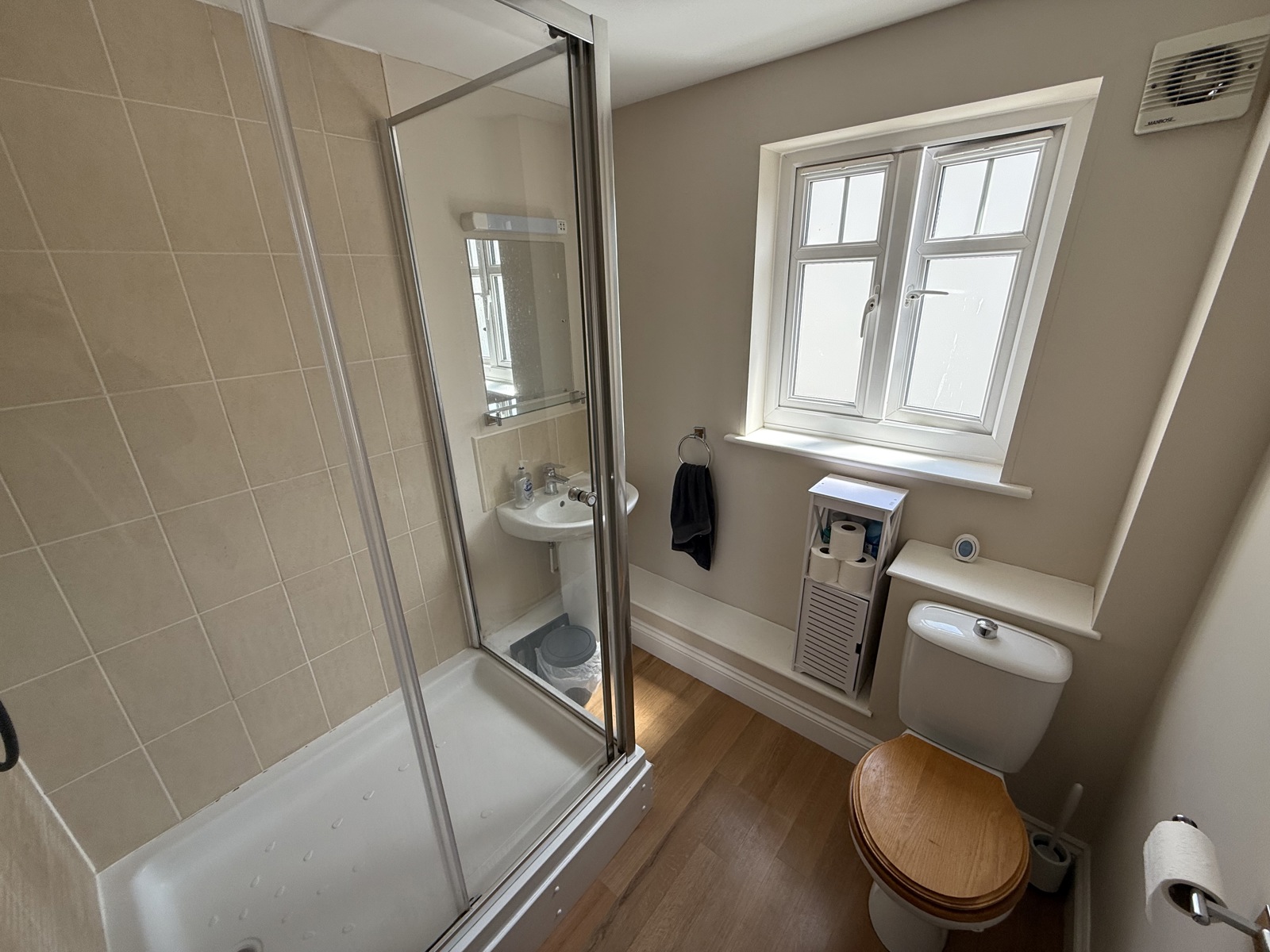 Shower, WC, basin, lino flooring, radiator, light fitting with frosted double glazed window to the side of the property.