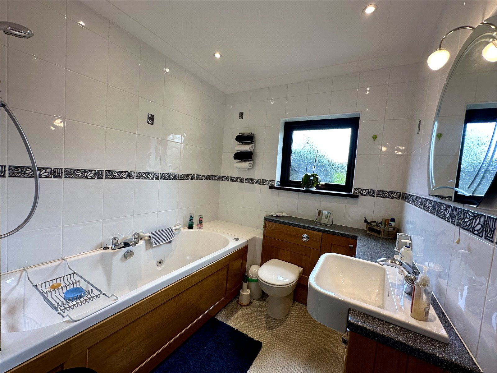 uPVC double glazed window to rear, modern suite comprising low level wc, wash hand basin, jacuzzi style bath with shower over, tiled floor, fully tiled walls, heated towel rail.