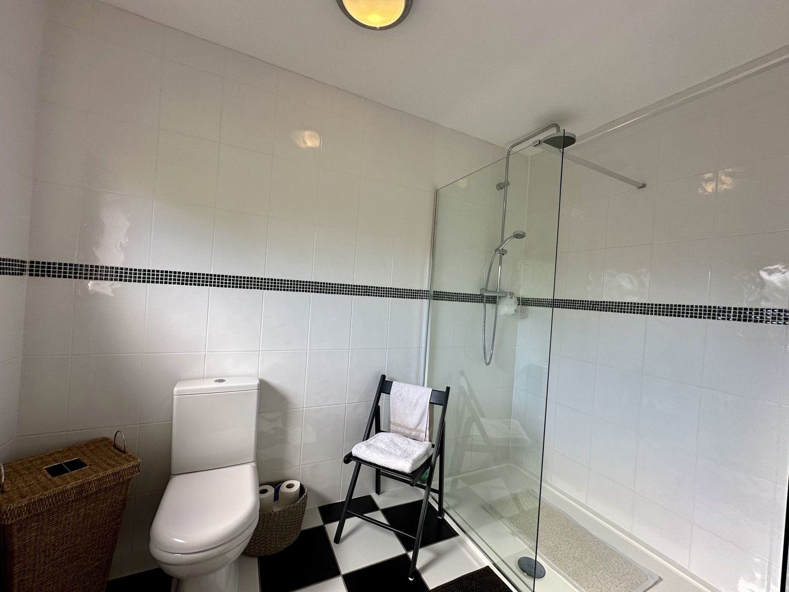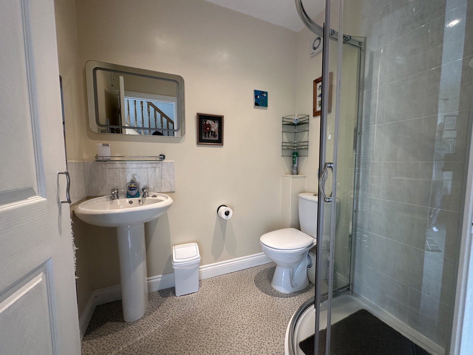 Suite comprising corner shower unit, low level wc, pedestal wash hand basin, heated towel rail.