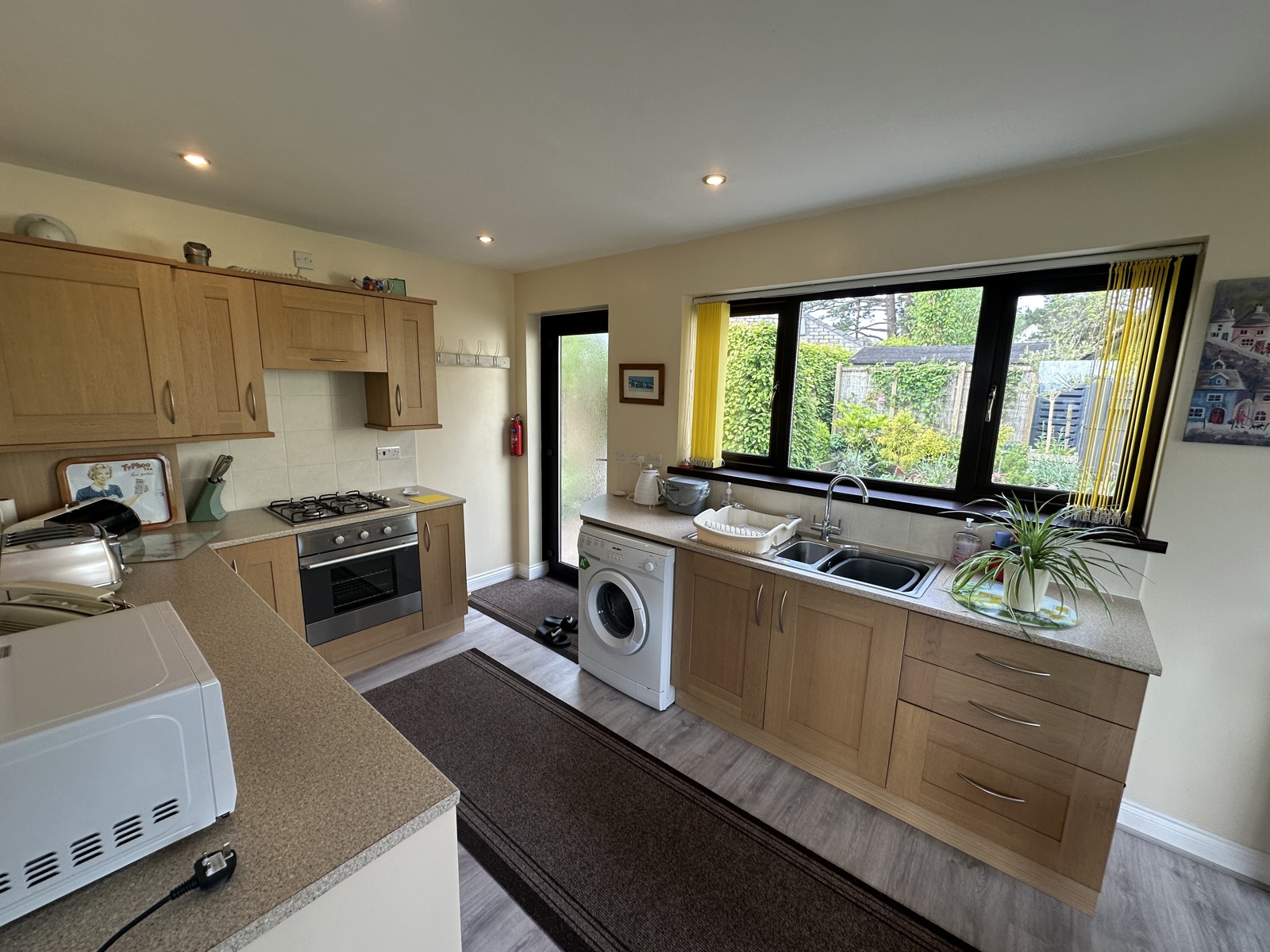 2 uPVC double glazed windows to rear, uPVC double glazed window to side, modern wall and base units, sink with mixer tap, integrated fridge, integrated extractor fan, radiator, oak flooring, door to utility room