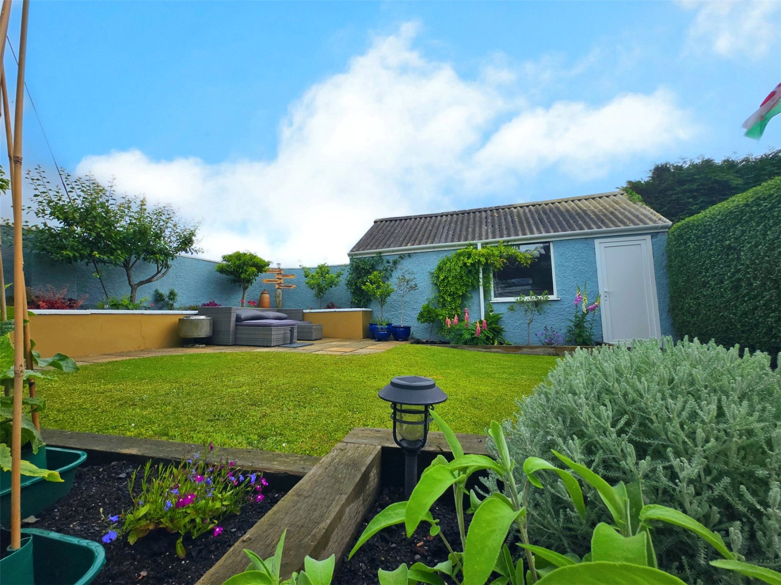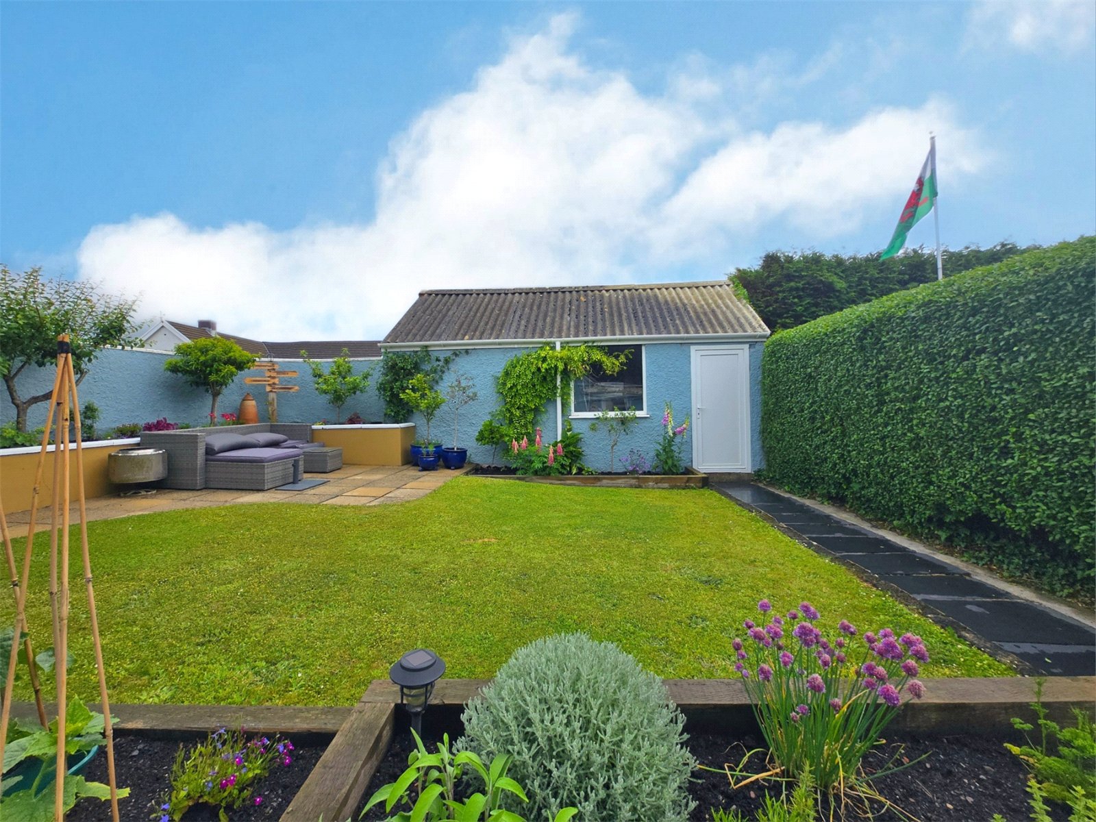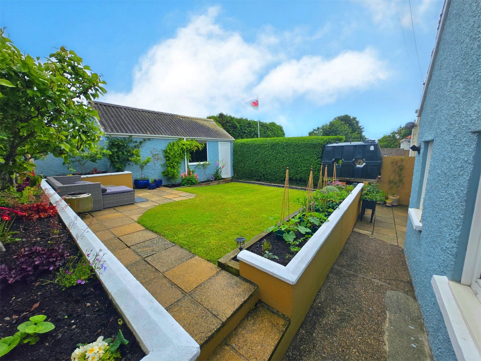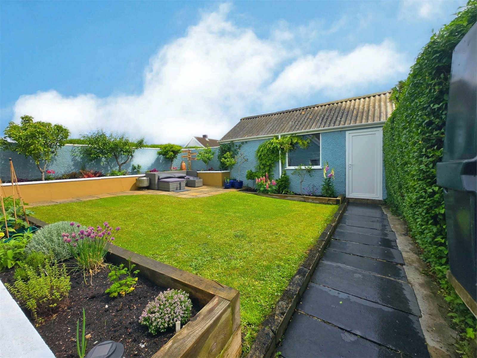 The garden enjoys a tranquil atmosphere, perfect for relaxing or entertaining. Its thoughtful layout provides space for outdoor seating, while the blend of vibrant blooms and greenery creates a picturesque retreat. The garage offers convenient storage options, complementing the practicality of the side access.