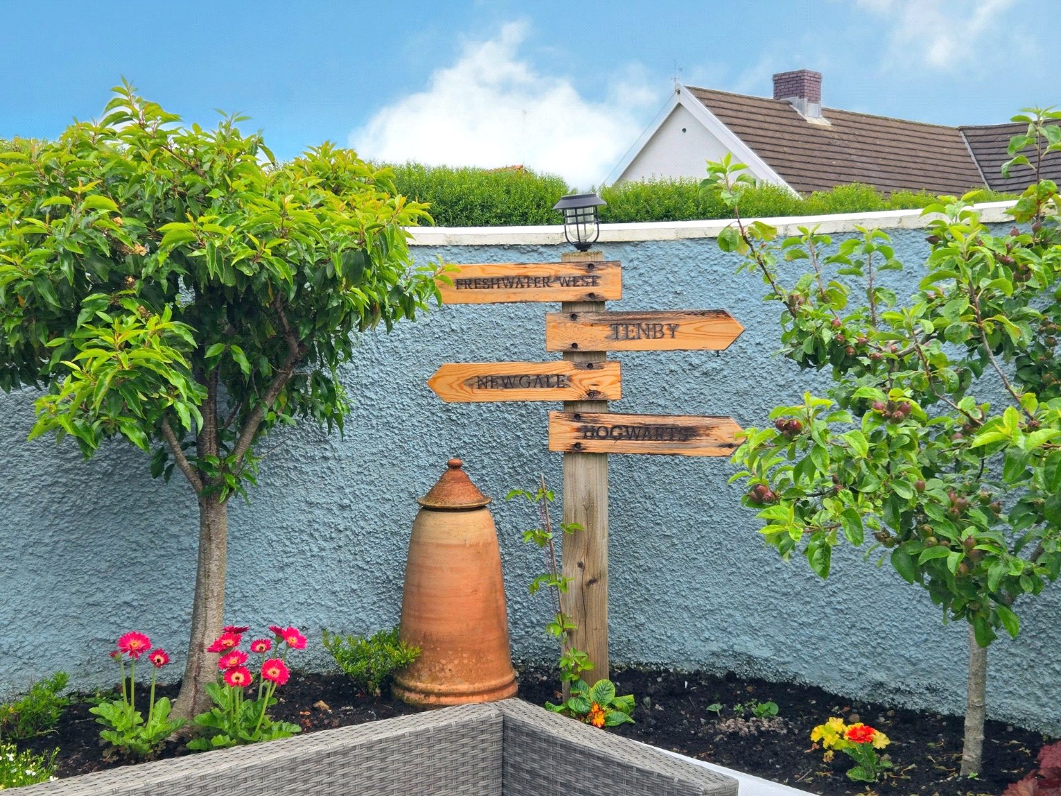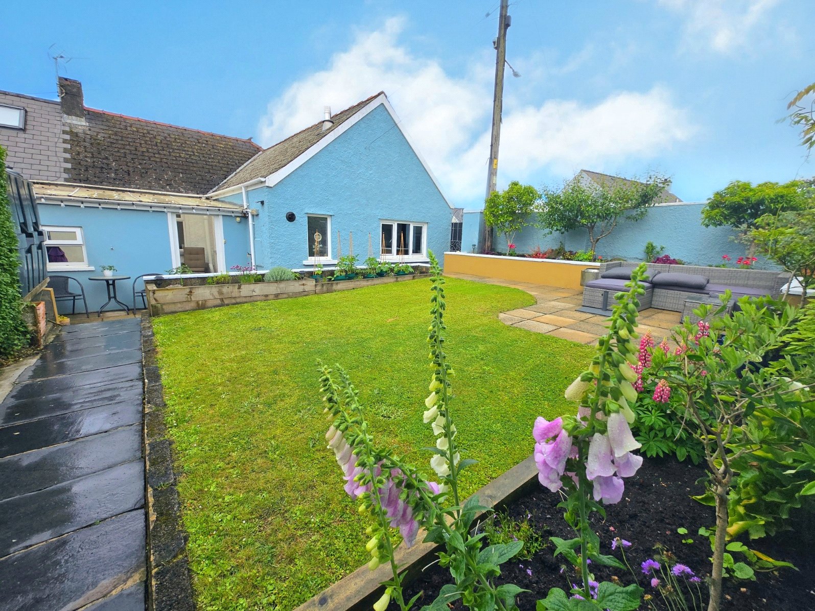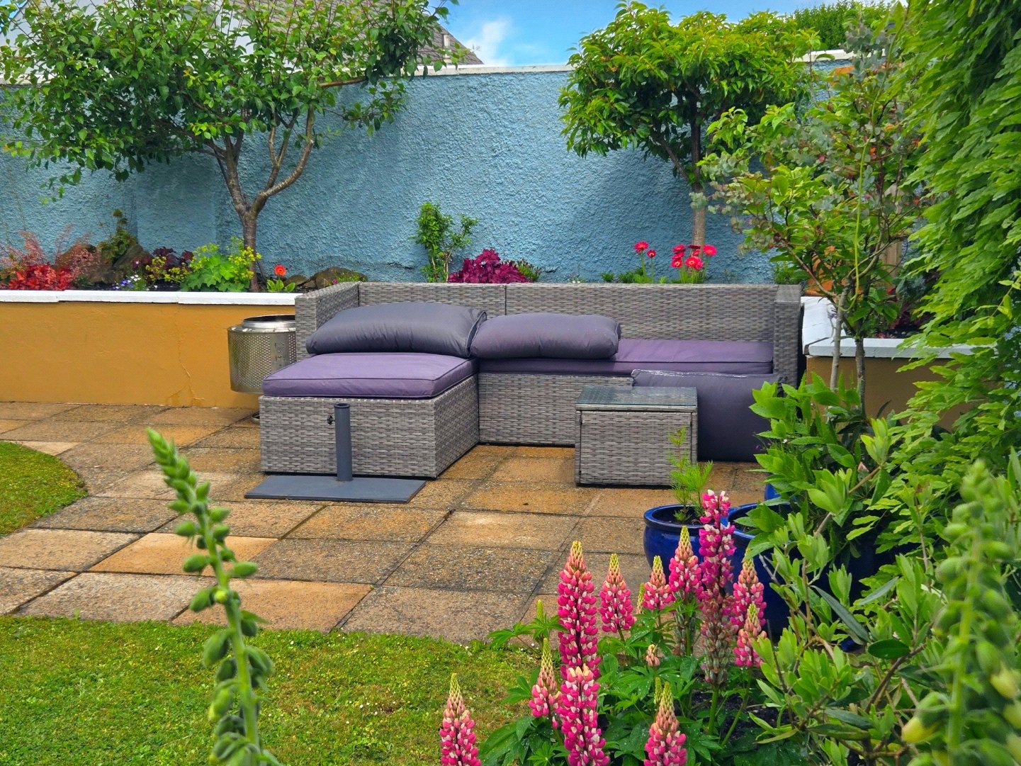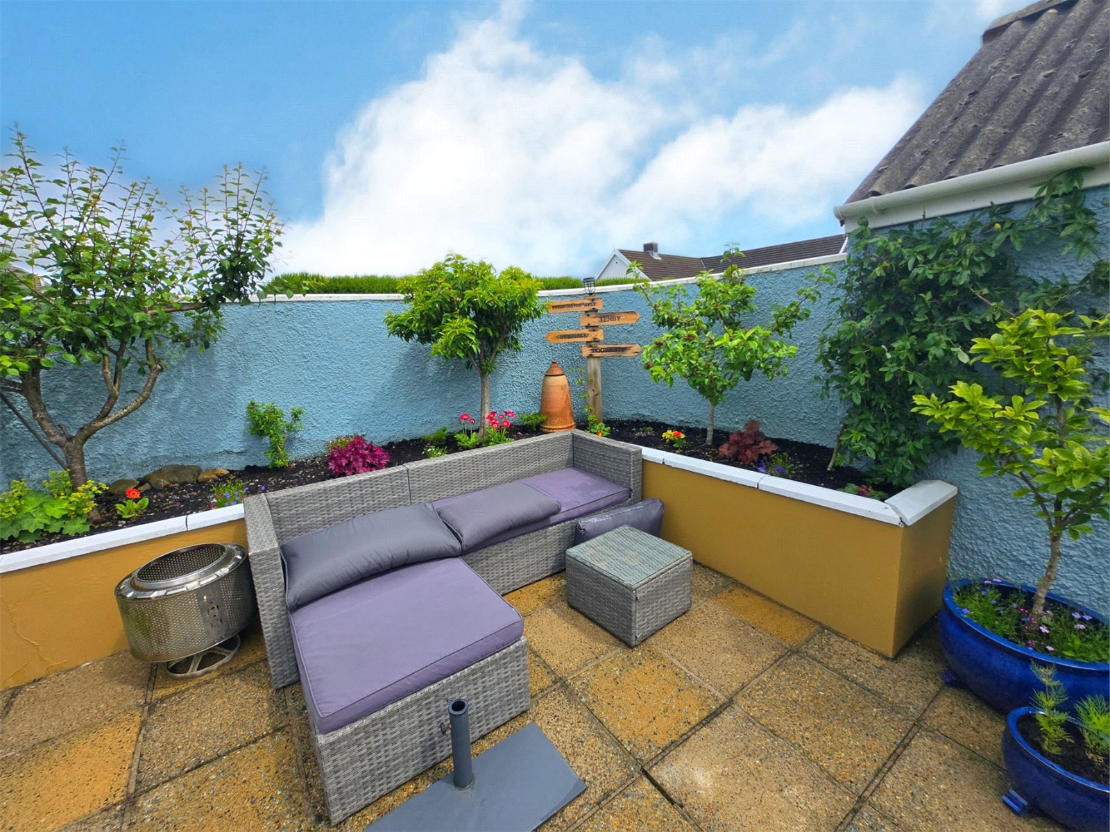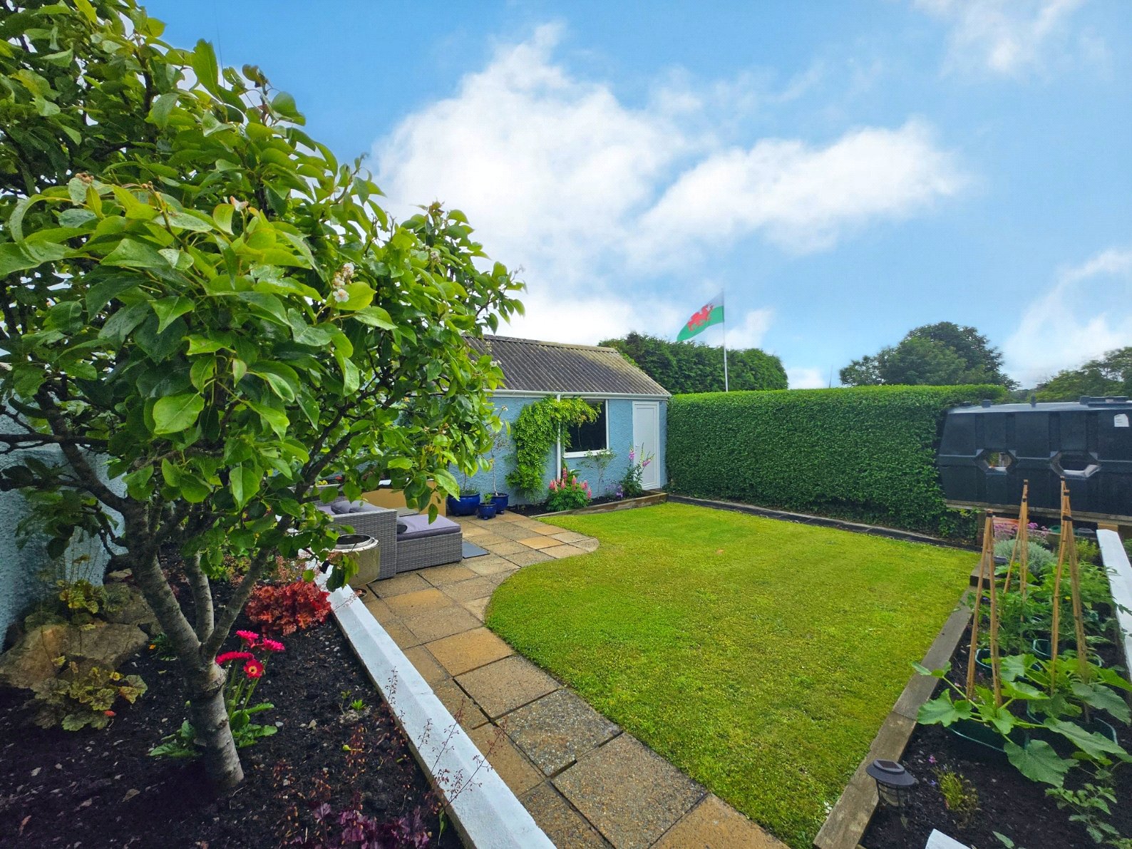 The garden enjoys a tranquil atmosphere, perfect for relaxing or entertaining. Its thoughtful layout provides space for outdoor seating, while the blend of vibrant blooms and greenery creates a picturesque retreat. The garage offers convenient storage options, complementing the practicality of the side access.