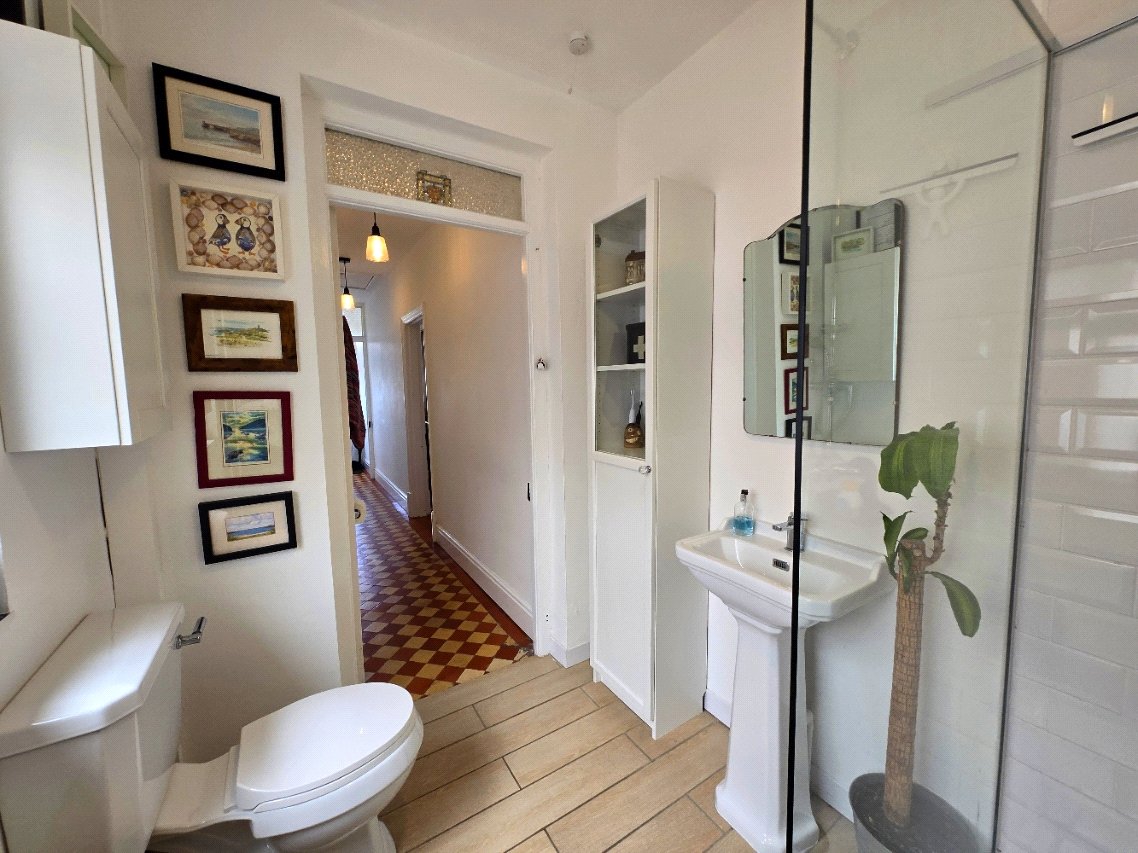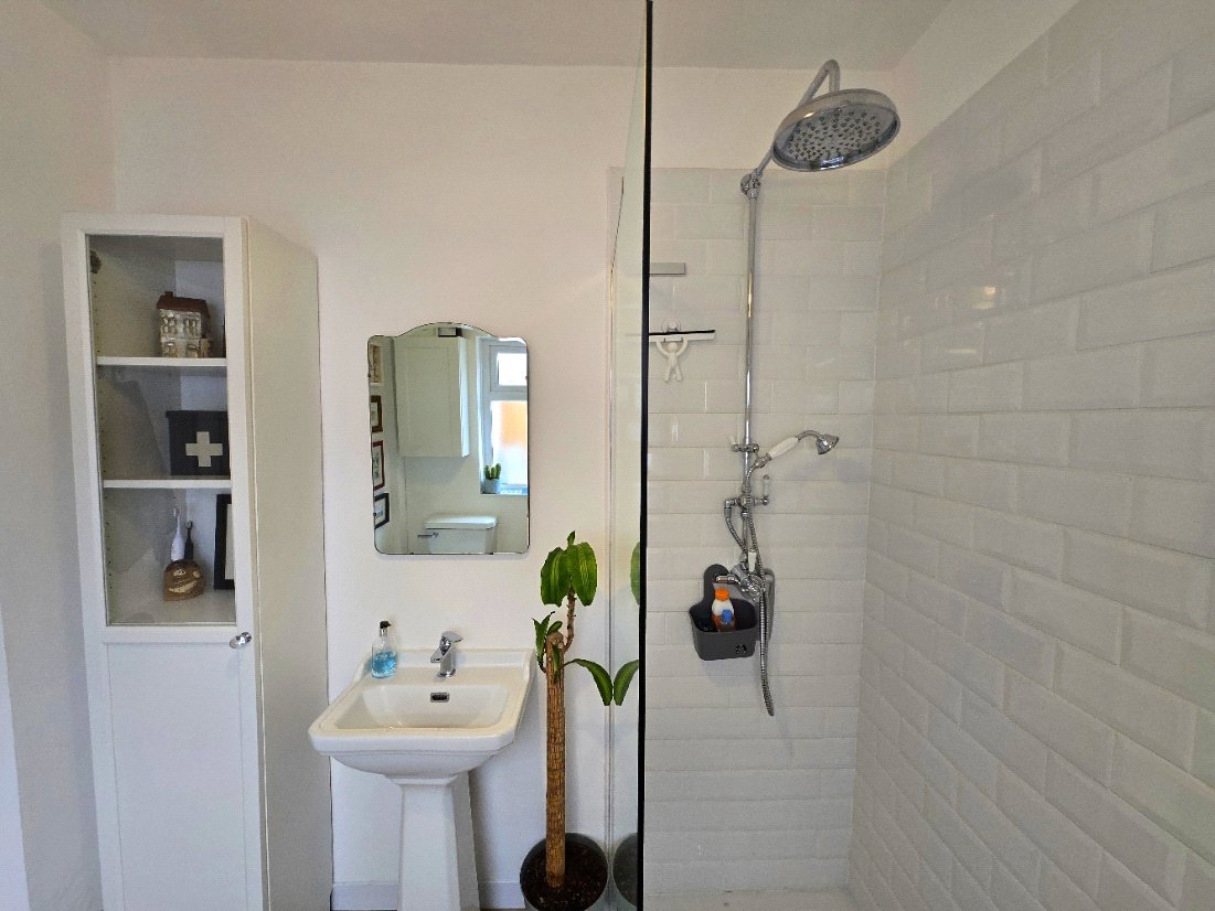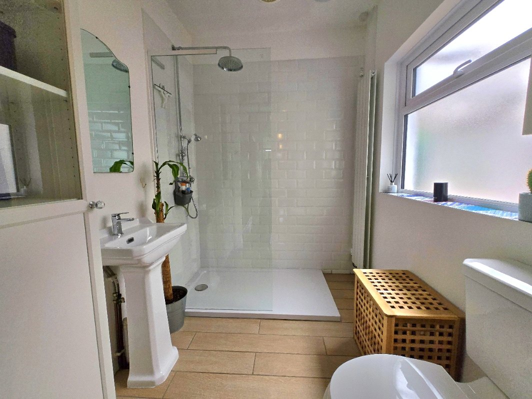 Tile flooring, low-level toilet, hand basin with mixer taps, obscure glass uPVC double glazed window to the side, walk in shower with floor to celling tiles and twin head thermostatic shower, radiator, light fitting.