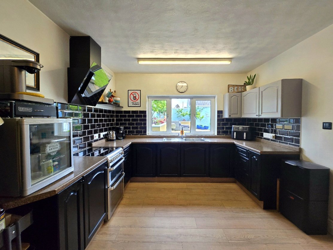 Laminate flooring, selection of base and wall units, room for cooker, extractor fan, room for fridge freezer, stainless steel sink with drainer and mixer tap, radiator, light fittings.