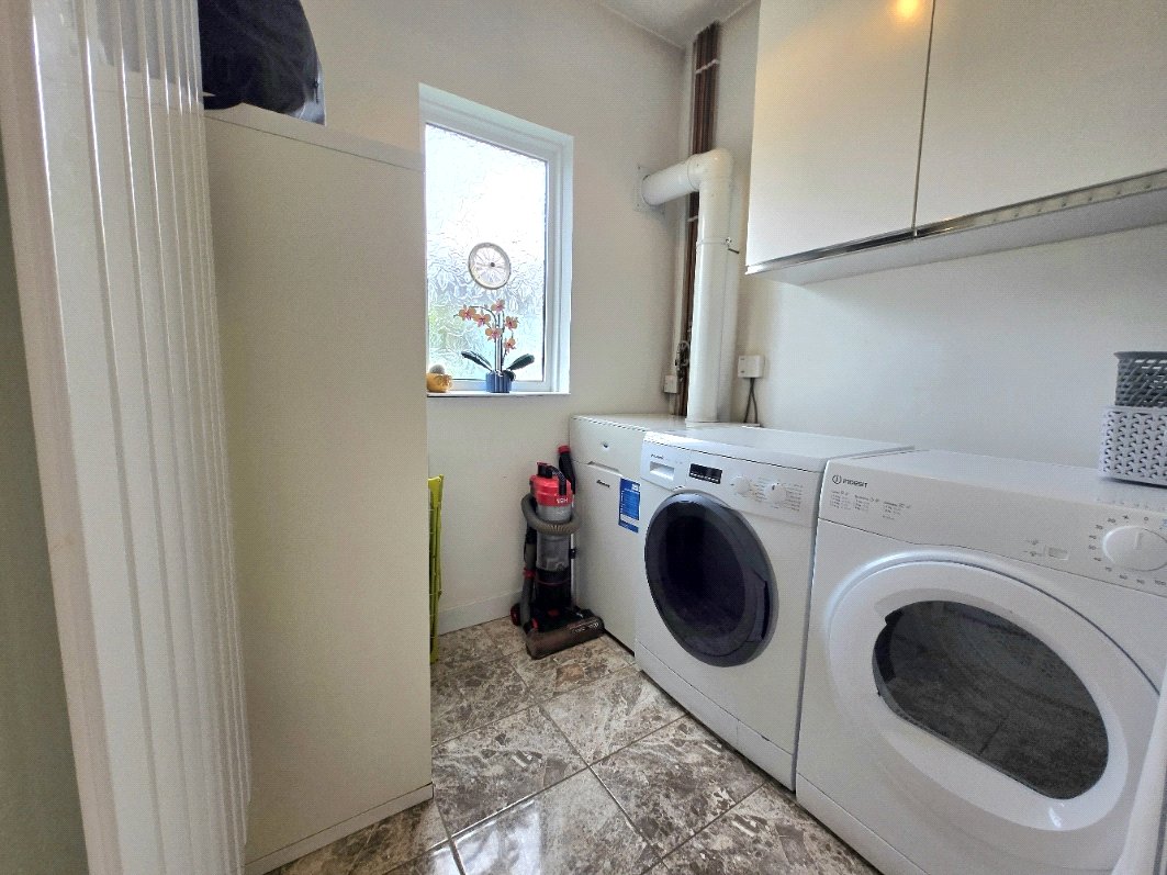 Tile flooring, room for washing machine and tumble dryer, storage cupboards, obscure glass uPVC double glazed window to the rear, light fitting.