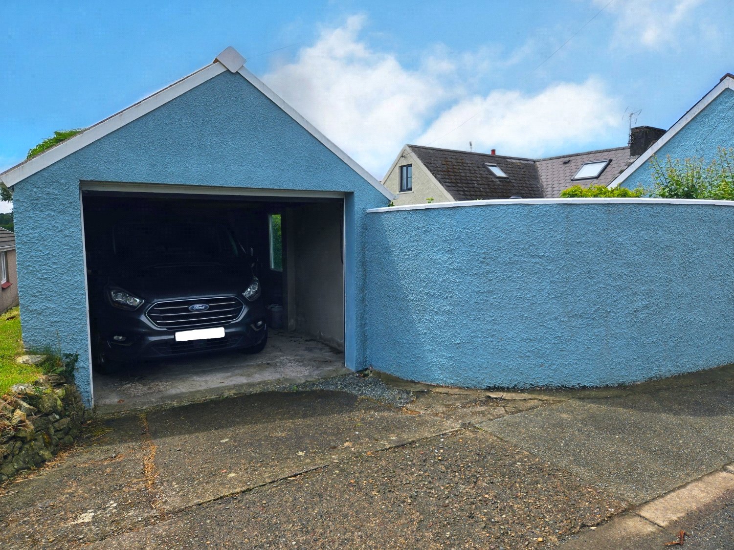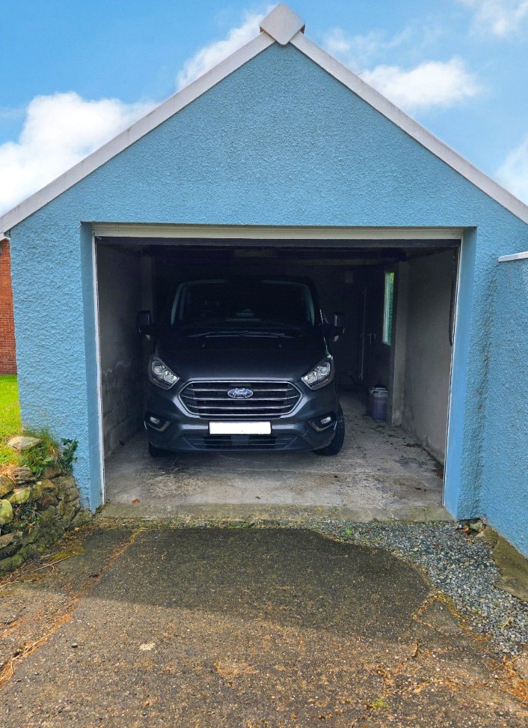 Large garage with electric roller door.