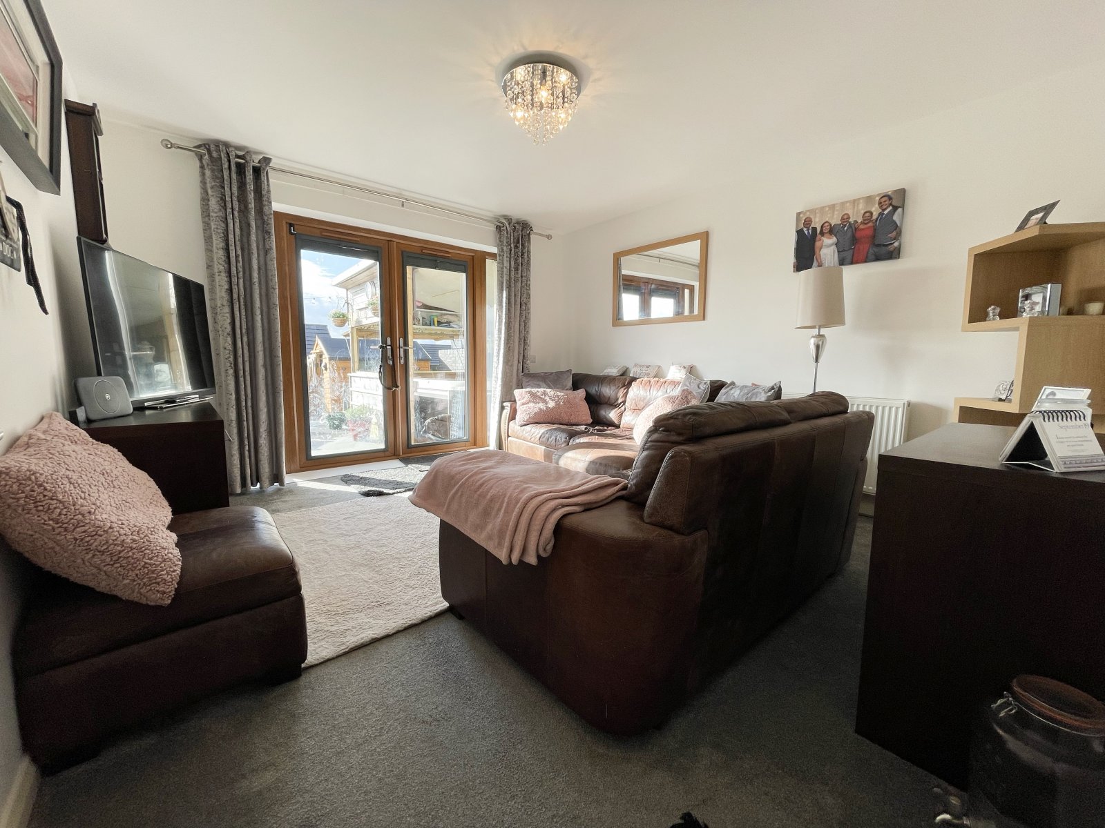 uPVC French doors giving access to rear garden, carpet flooring and wall mounted radiator.