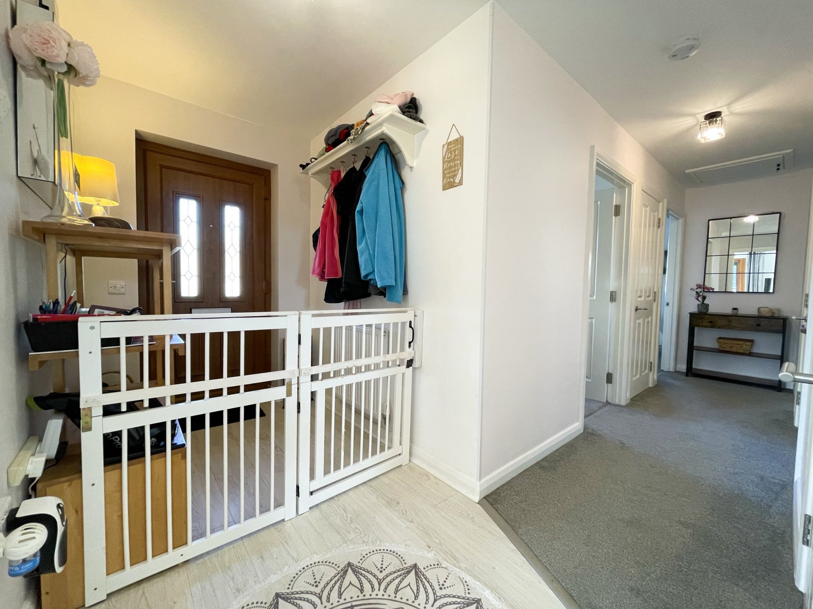 uPVC frosted glazed door, Amtico and carpet flooring, storage cupboard, doors leading to all rooms.
