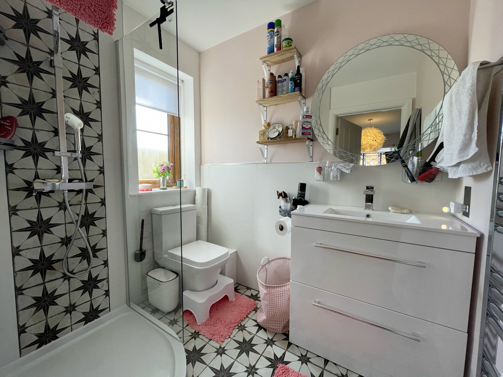 uPVC double glazed obscured window, tiled flooring, heated towel rail, mixer tap hand wash basin, Shower, WC.
