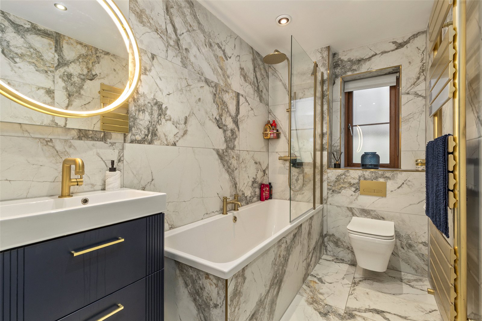Marble Floor and Wall Tiles, Bath with Shower Over, WC, Wall Mounted Sink, Towel Rail, Window, LED Spotlights