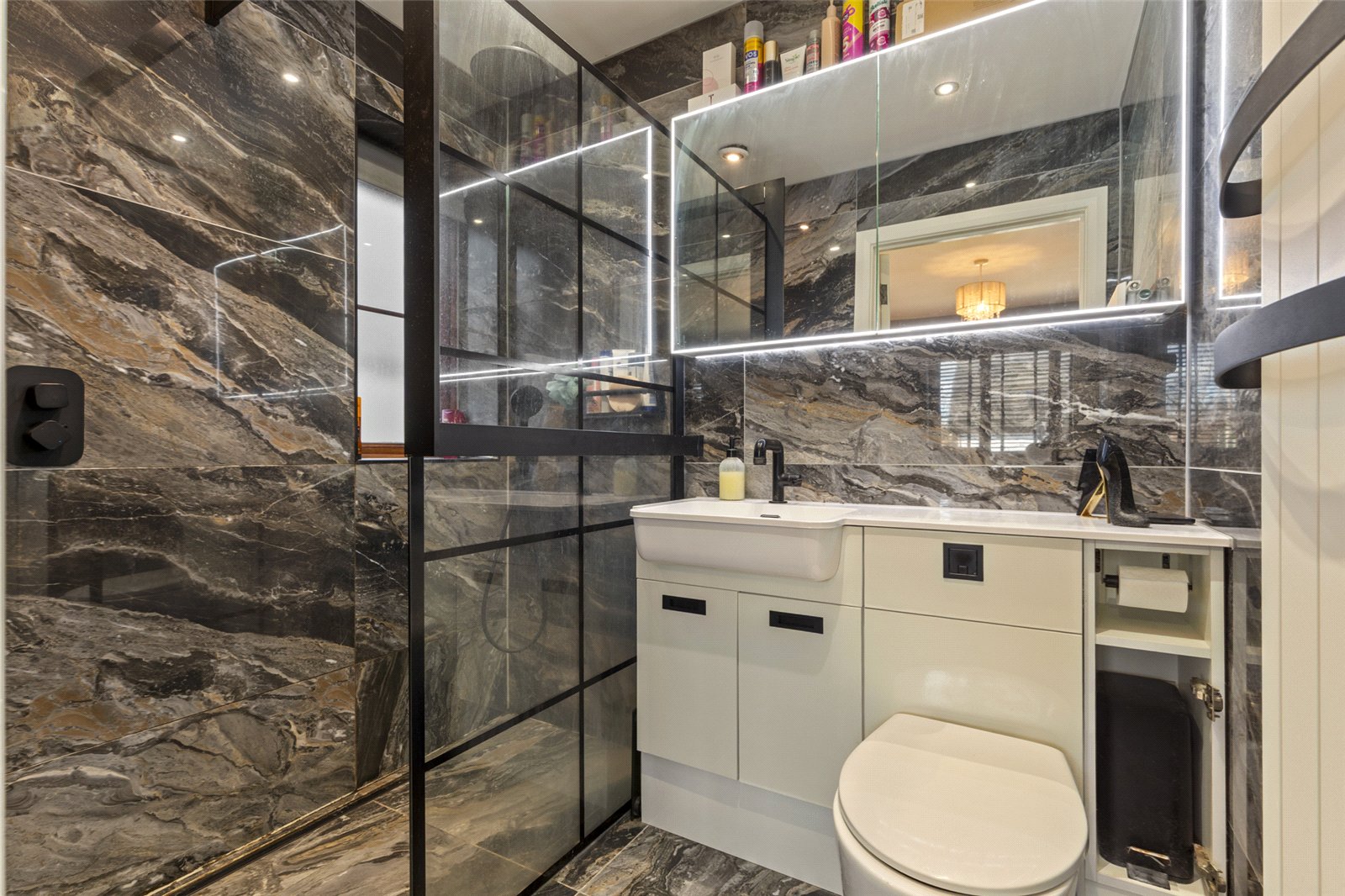 Marble Floor and Wall Tiles, Mordern Shower, WC, Wall Mounted Sink and Unit, Towel Rail, Wall Mounted Cabinet, LED Lighting