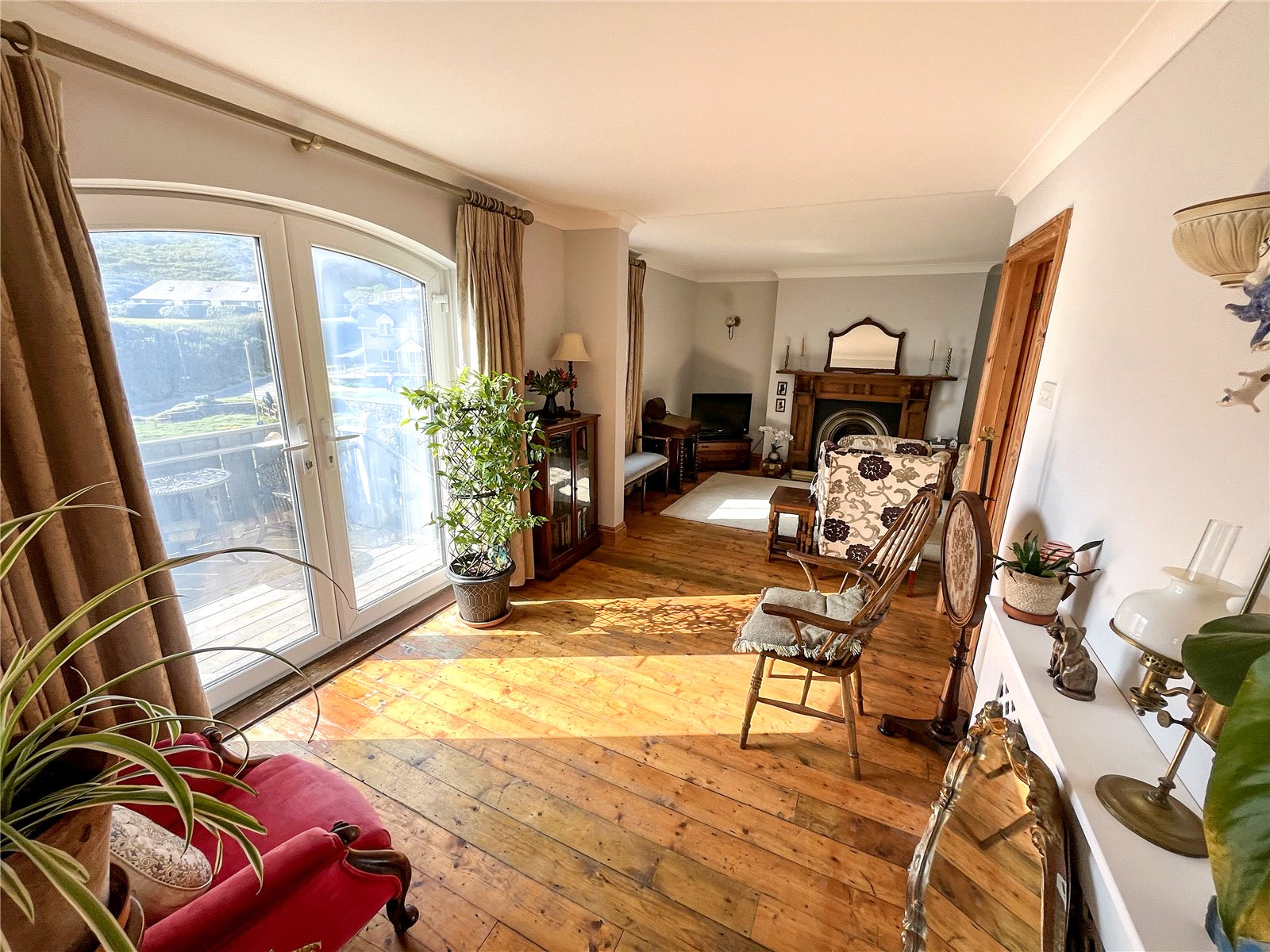 Sizeable L-shaped lounge affording exquisite views over Nolton Haven beach. Comprising of wooden flooring, fireplace with oak mantel and stone hearth, lighting, radiator, uPVC triple-glazed windows and French doors to terrace, as well as access to;