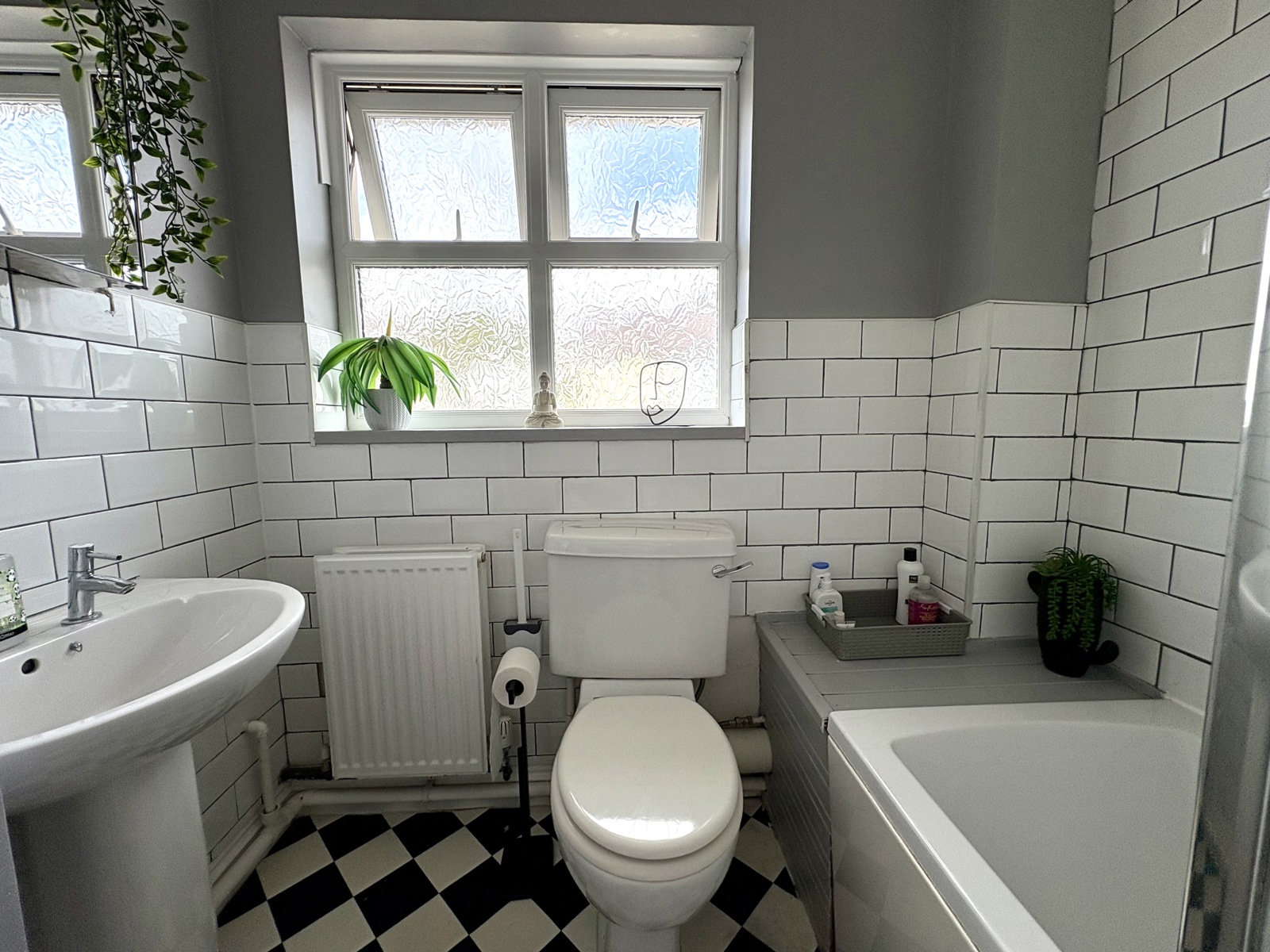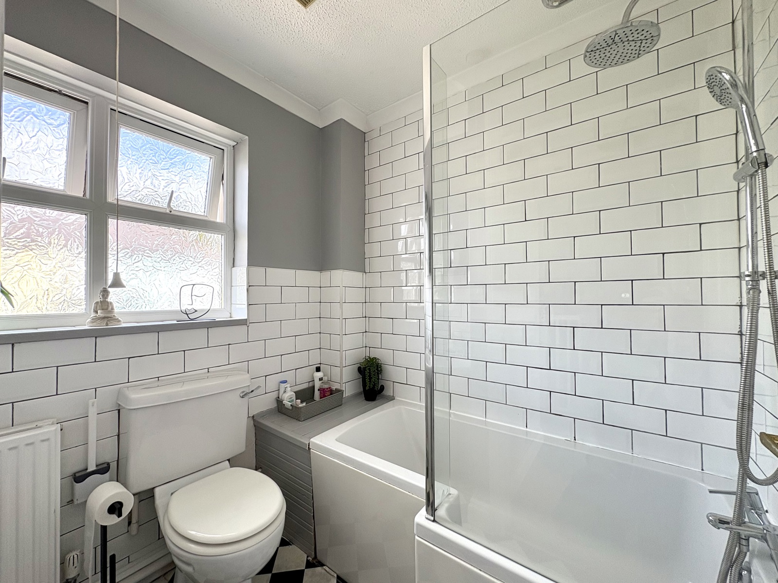 UPVC obscure double glazed window to front. Suite comprising: bath with shower over, WC, wash hand basin, tiled surrounds, extractor fan, radiator, vinyl tile floor.