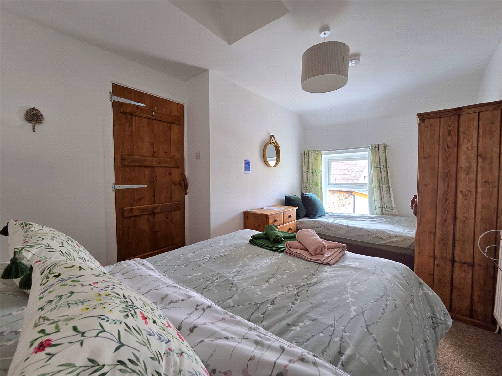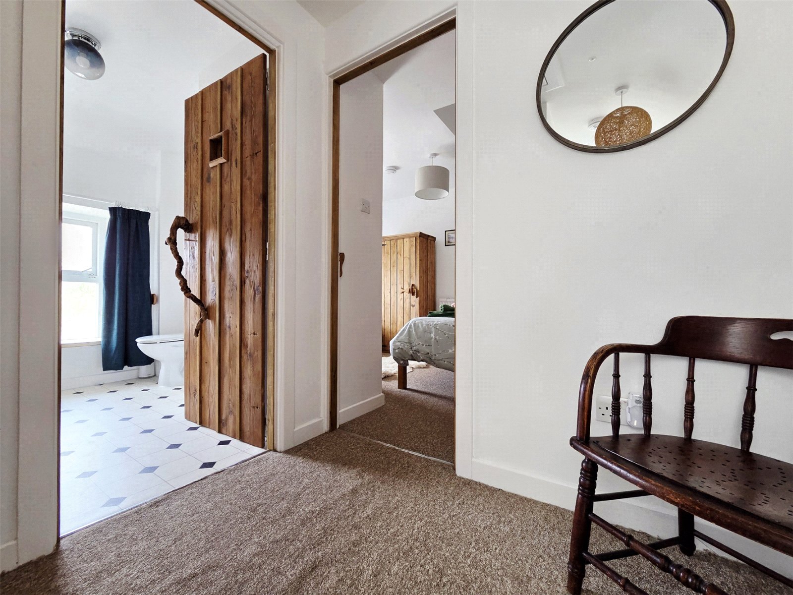 A charming and well-proportioned second bedroom, providing a comfortable and private space for guests or a family member. The room is bathed in natural light from a large window and is tastefully decorated in a neutral palette, creating a peaceful and calming atmosphere. With its compact yet efficient layout, the room offers ample space for a double bed and freestanding furniture. The exposed wooden door adds a touch of character, in keeping with the property's overall charm.