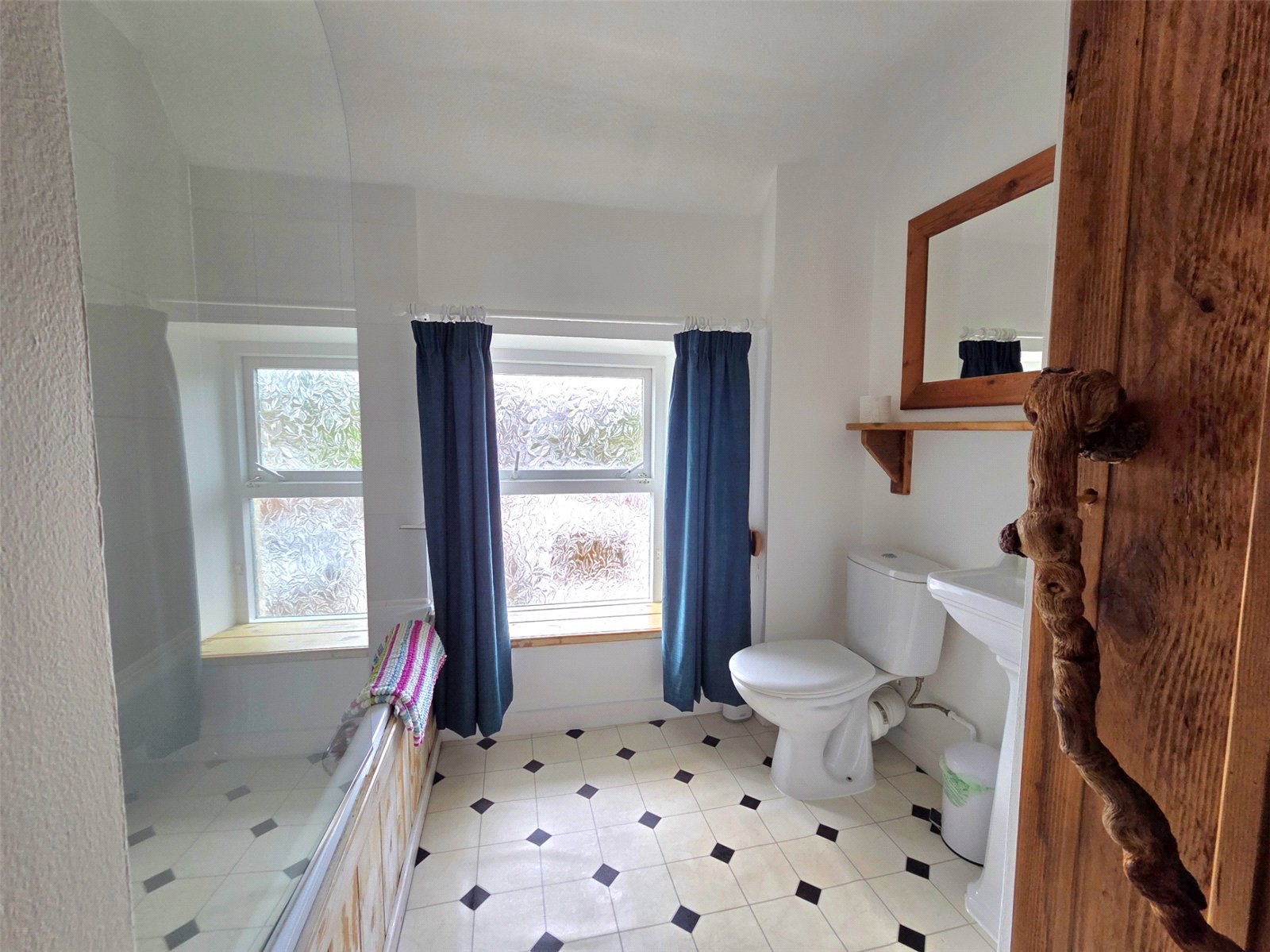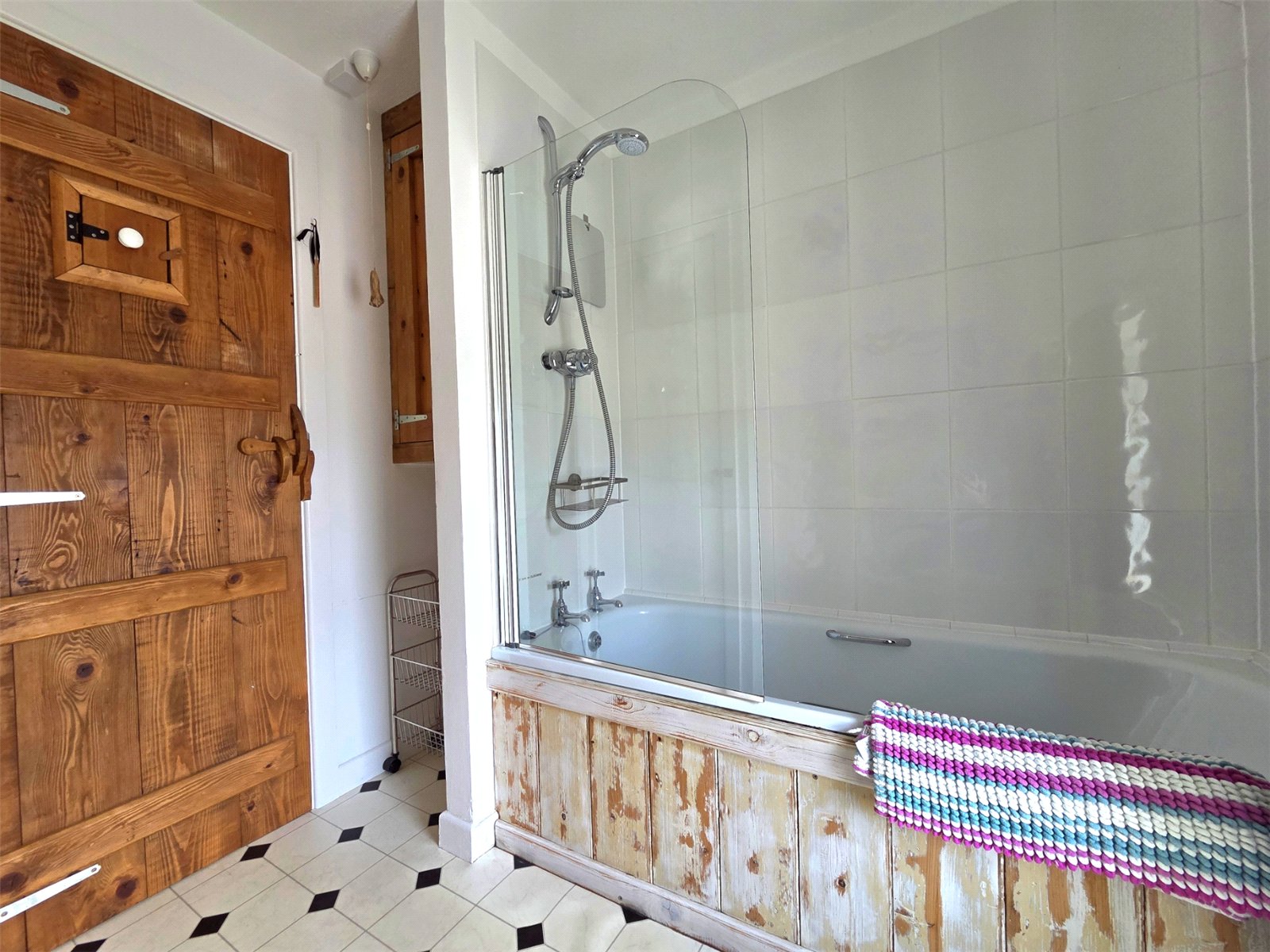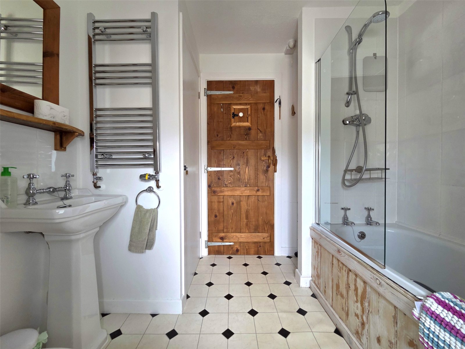 This charming and well-appointed family bathroom combines period character with modern convenience. The room features a full-size bath with an overhead shower and a glass screen, providing a versatile solution for both relaxing soaks and quick showers. The pedestal basin and WC complement the traditional feel, while the striking black and white tiled floor adds a touch of classic elegance. Character is further enhanced by the exposed wooden doors, which are in keeping with the property's overall rustic charm. A heated towel rail provides warmth and practicality.