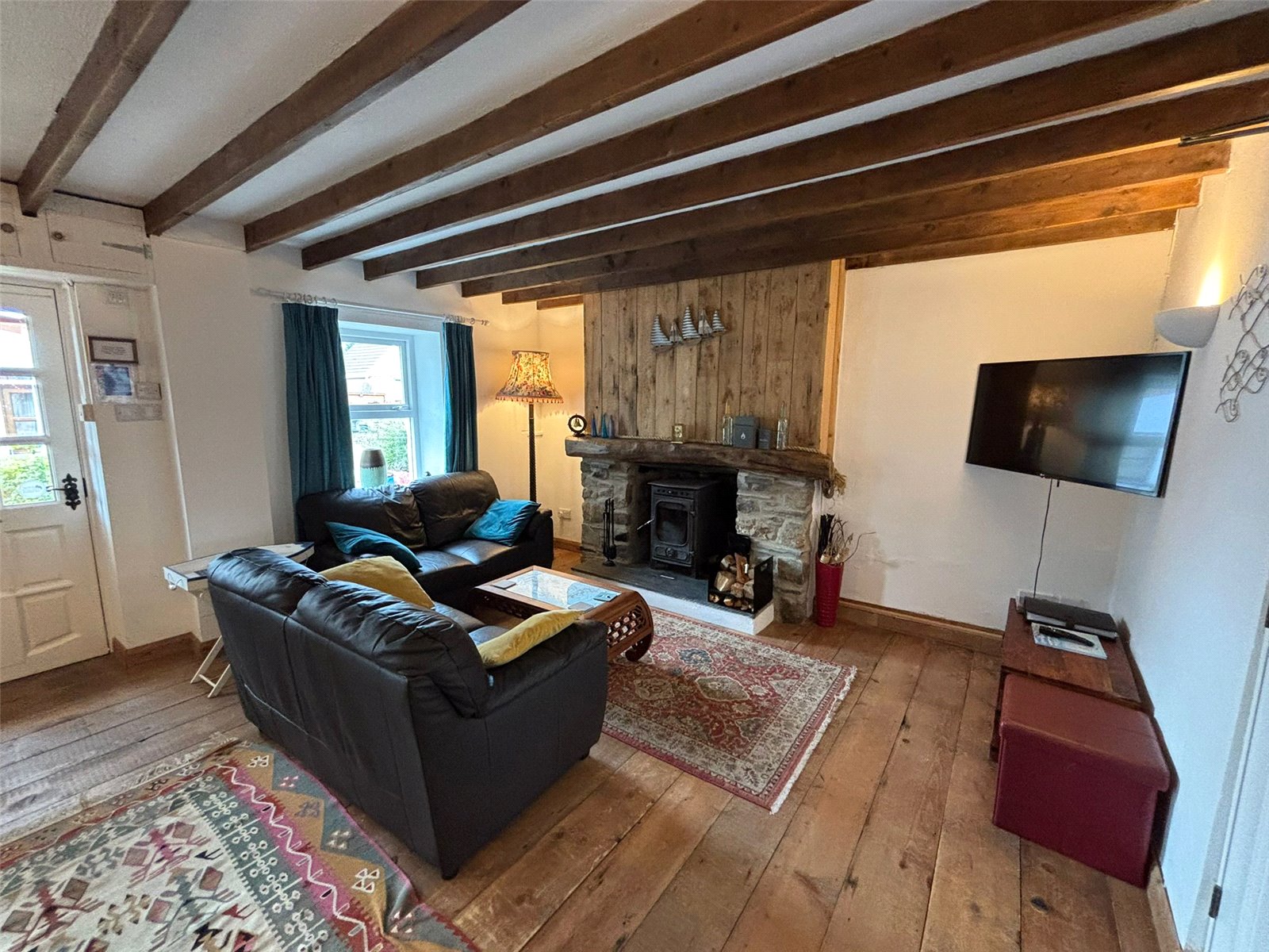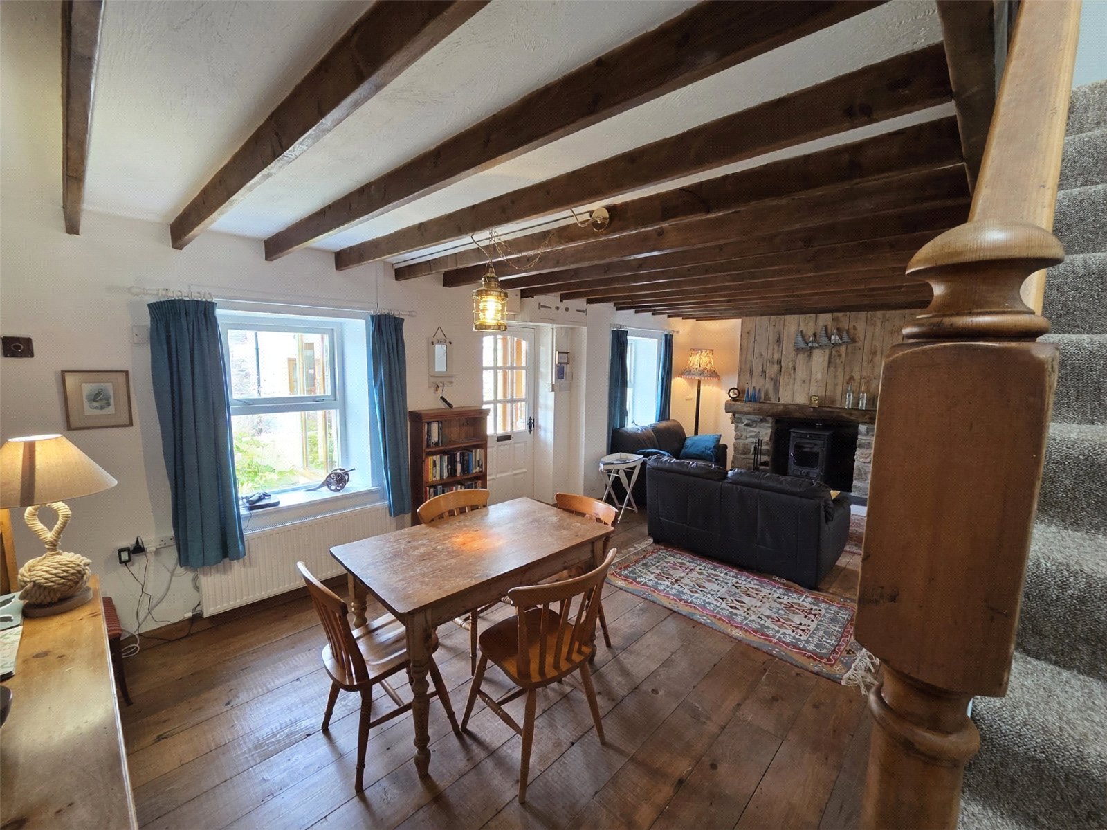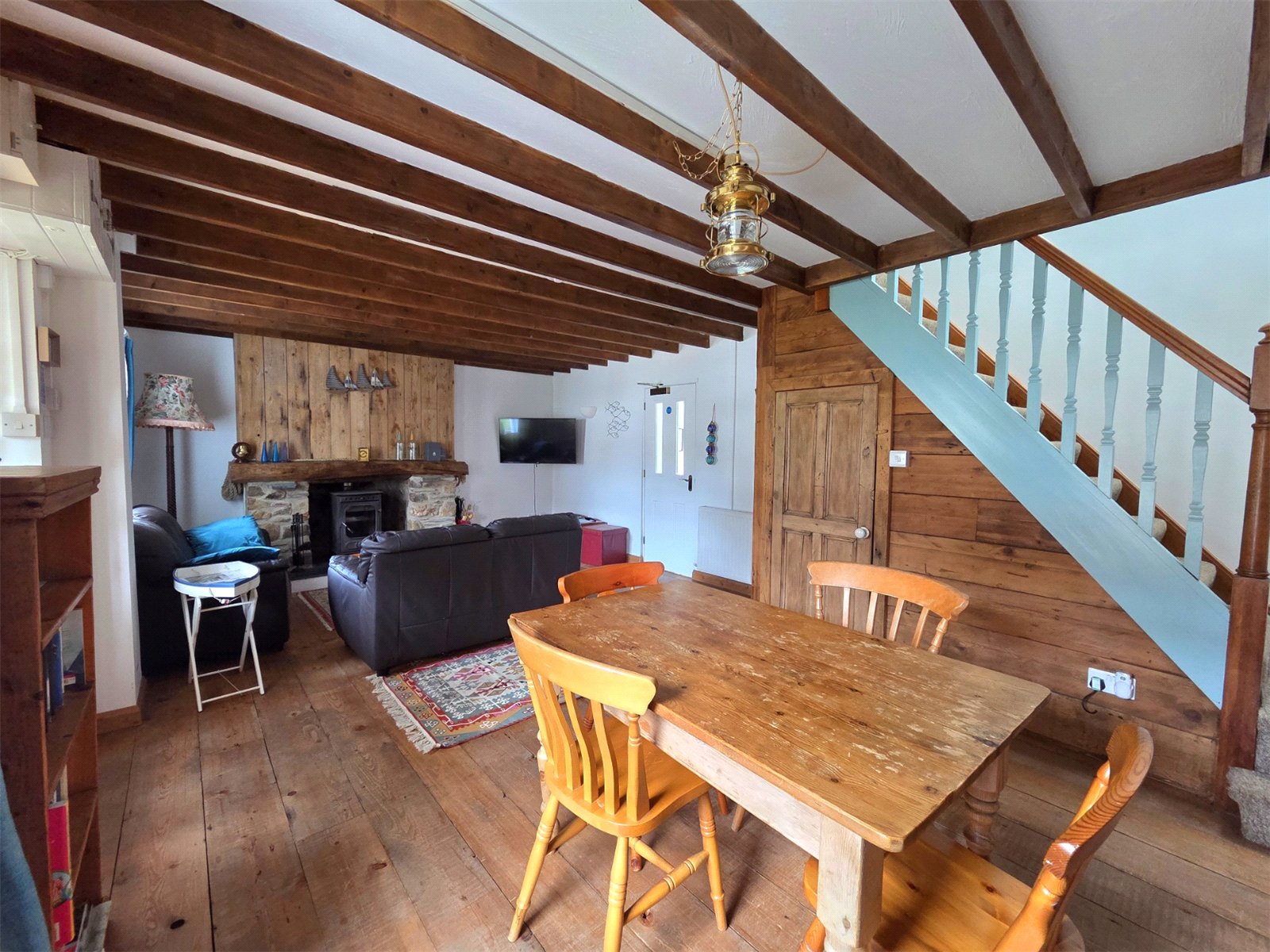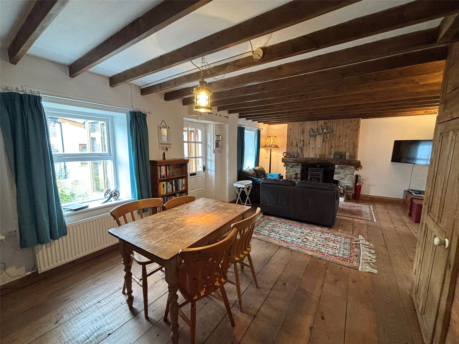 A Characterful and Cosy Open-Plan Living & Dining Space, Step into the heart of this charming home, where a character-filled living and dining area provides a perfect blend of rustic warmth and comfortable living. The space is defined by its stunning period features, including beautiful exposed timber ceiling beams and a striking inglenook fireplace with a slate hearth and a multi-fuel log burner, creating a truly inviting focal point.