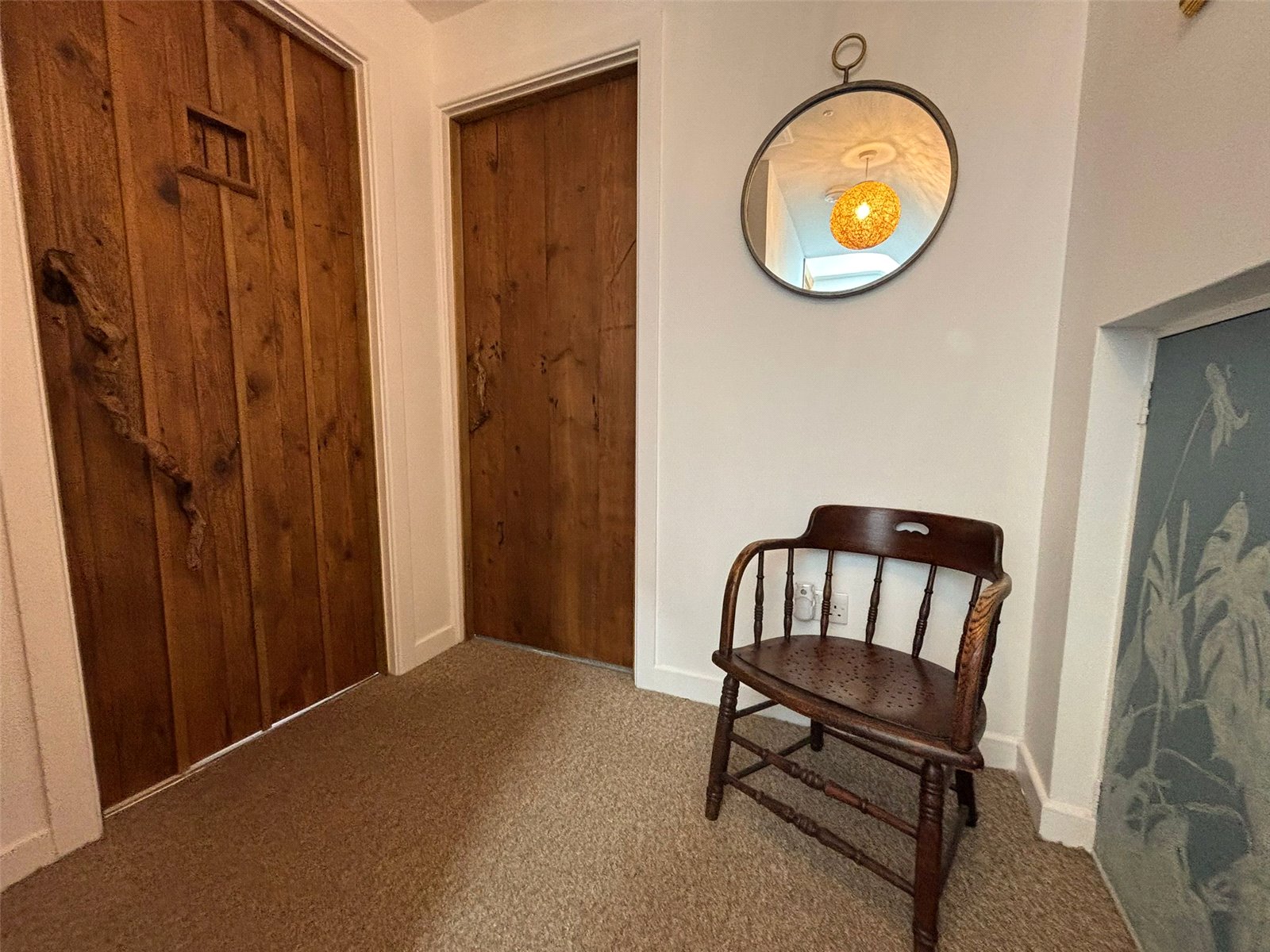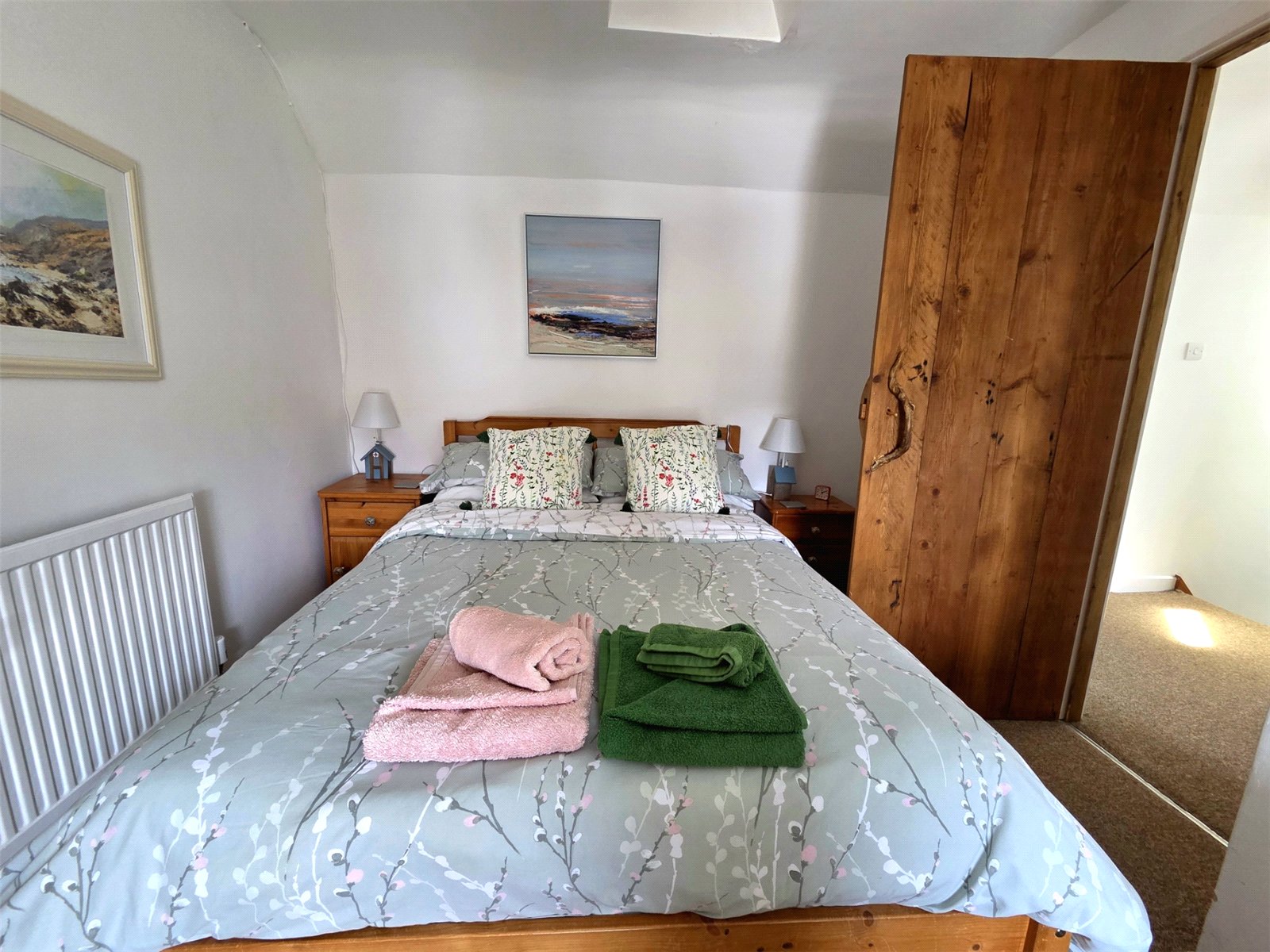 Character abounds with attractive exposed wooden doors, adding a rustic and charming touch to the room's aesthetic. The room provides ample space for a double bed and freestanding furniture, as well as a clever layout that could accommodate an additional single bed or further storage, as depicted. It's a comfortable and well-proportioned room, perfect for unwinding at the end of the day.