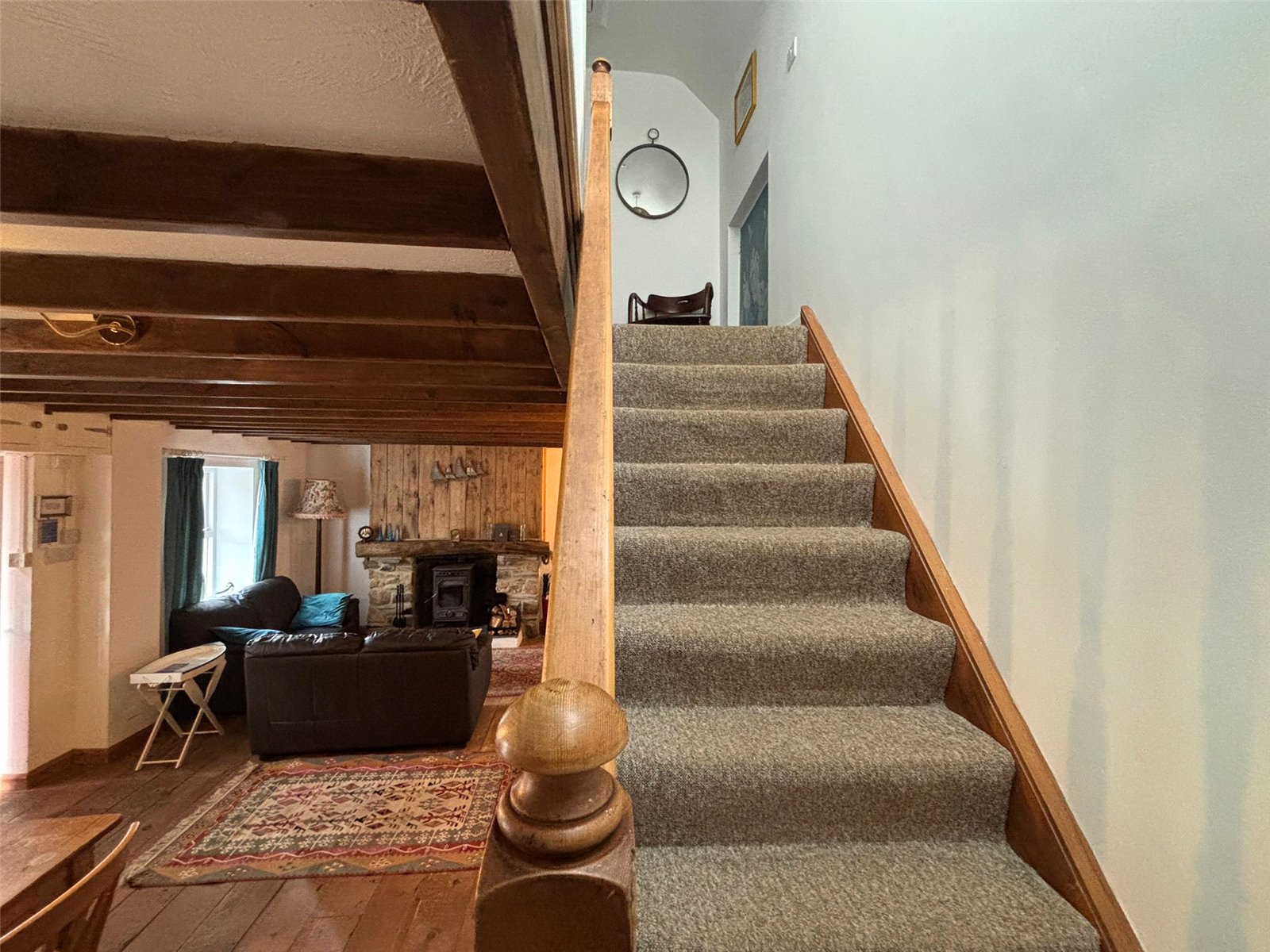 With multiple windows, the room is filled with natural light, and the cosy atmosphere is enhanced by the warm glow of the log burner. This is more than just a living room; it's a true hub of the home, offering a perfect, tranquil retreat for colder evenings. A classic staircase with a timber balustrade rises from the corner of the room, adding to the property's unique appeal.