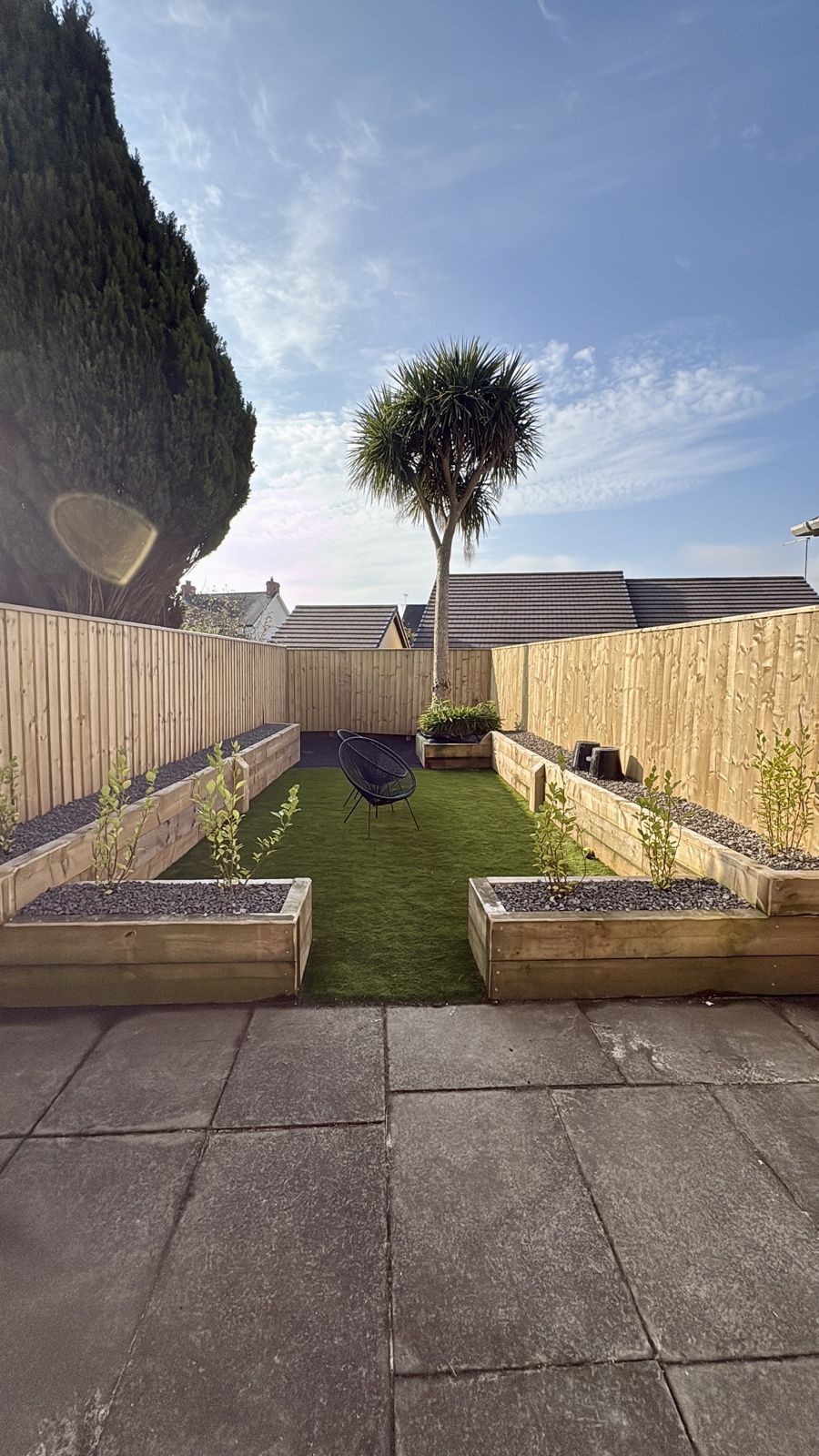 Modern living room featuring LVT flooring, a contemporary wall panel, and an integrated electric fireplace. It boasts a rear facing double-glazed window, a radiator, and double doors that open to the garden. A staircase leads to the upper floor.