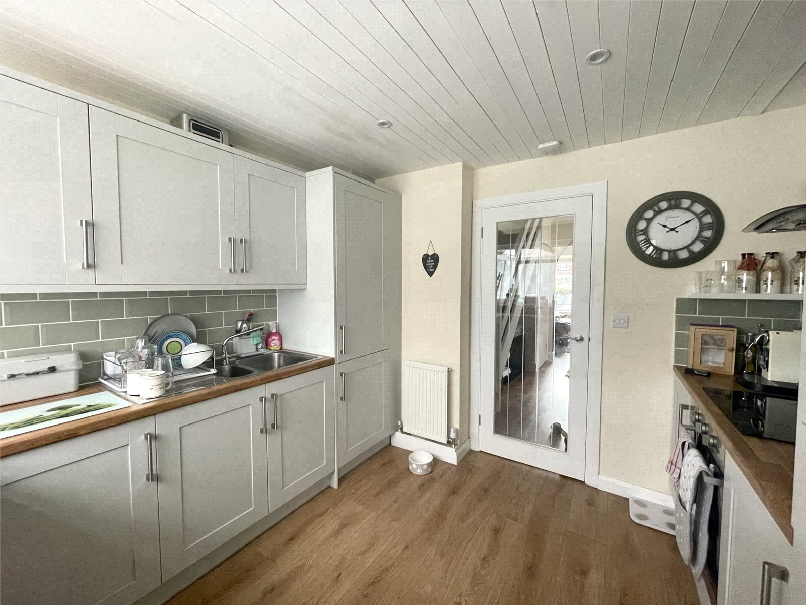Laminate floor continues, a range of base and wall units with tiles surround, integrated fridge, freezer, electric oven, electric hob with overhead extractor fan and light, 1.5 sink and drainer with taps, access to new boiler, radiator, spot lights, door to: