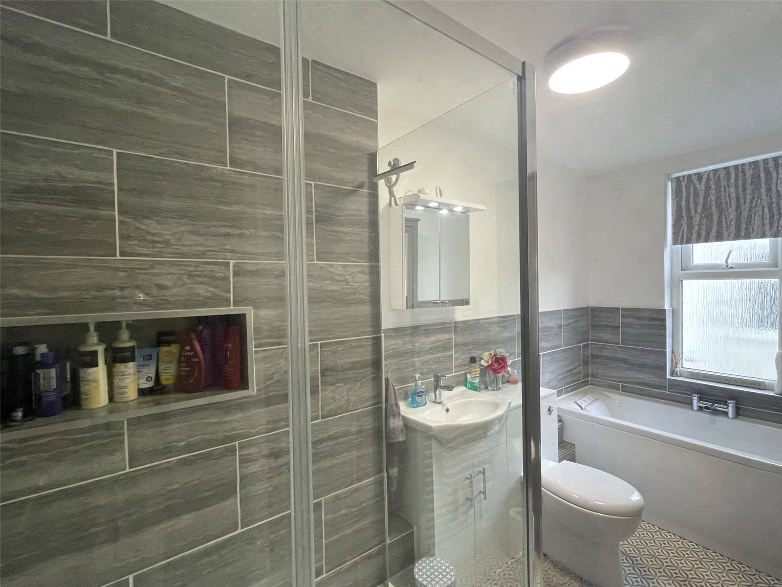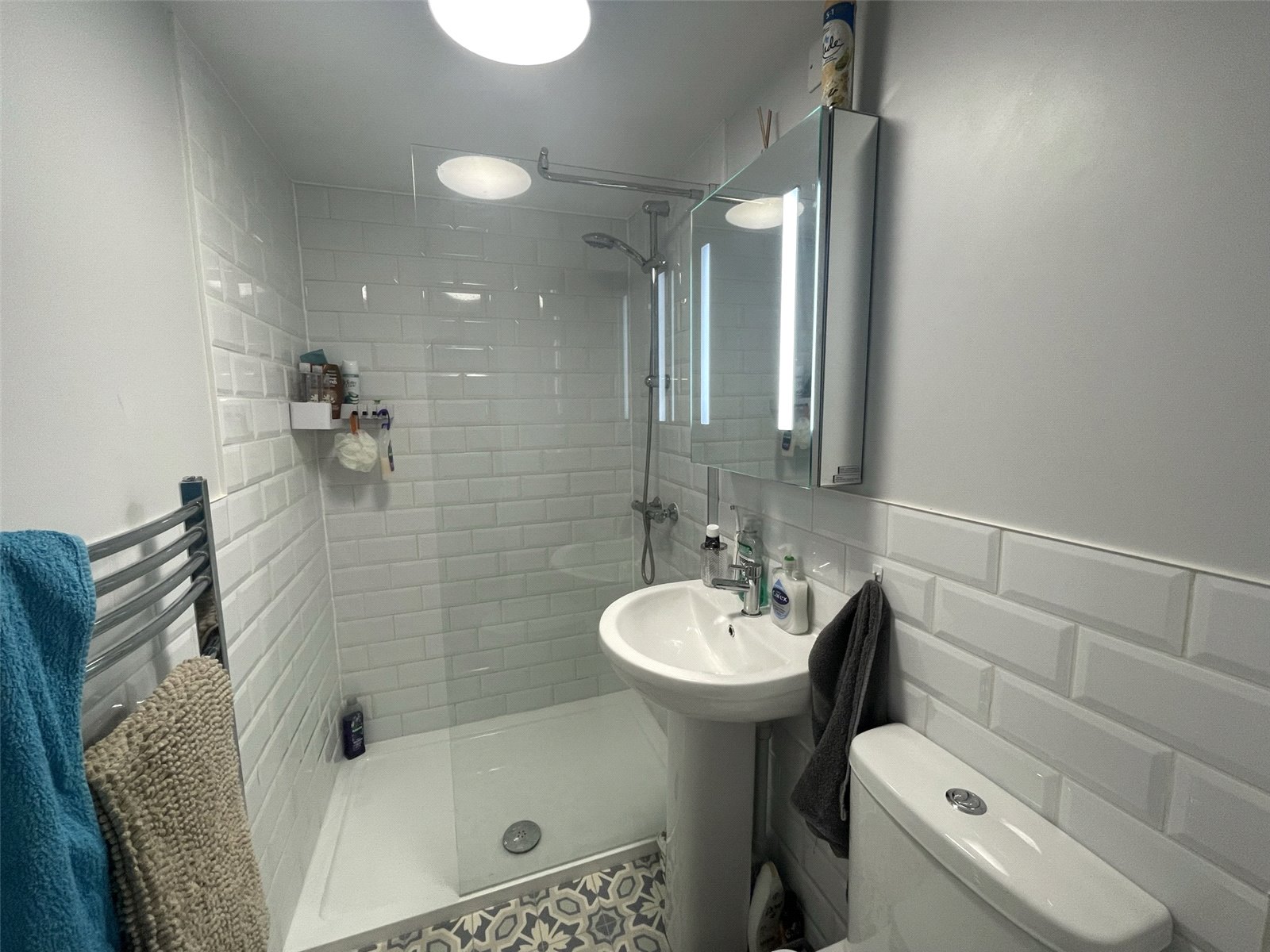 Vinyl floor, partially tiled walls, walk in shower, WC and wash hand basin vanity unit, heated towel rail, ceiling light, uPVC double glazed window with obscure glass.