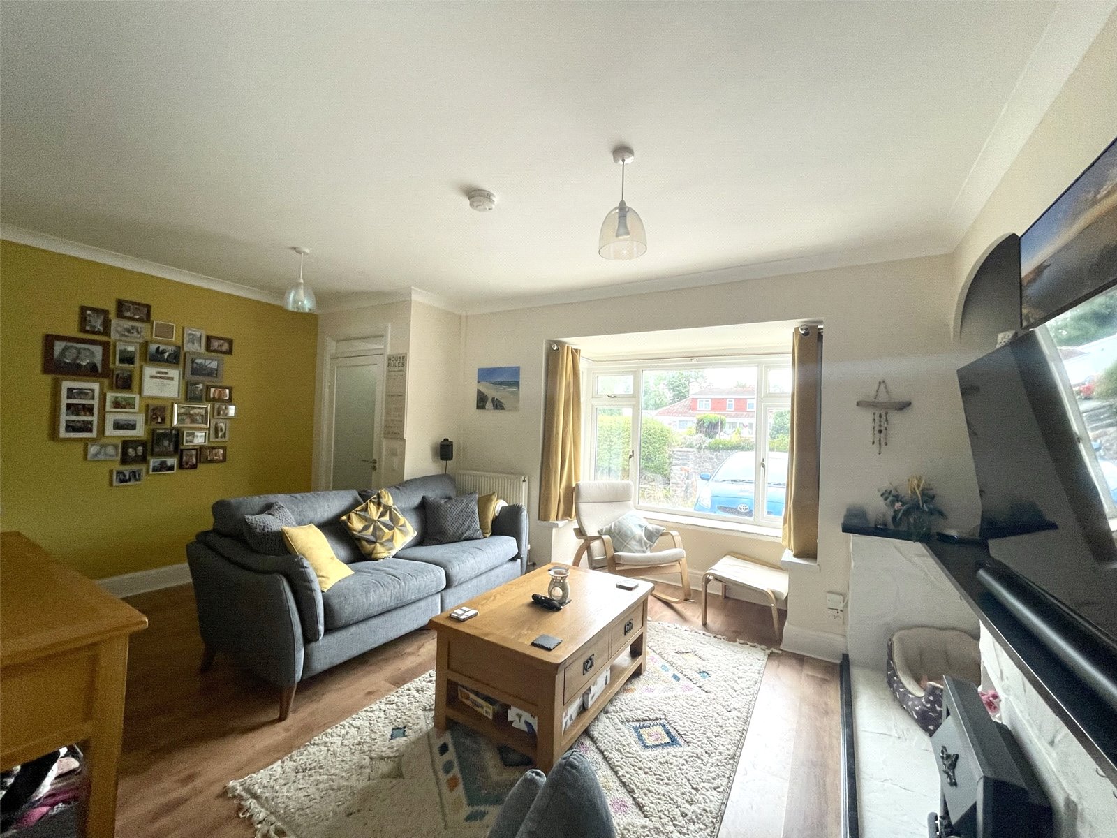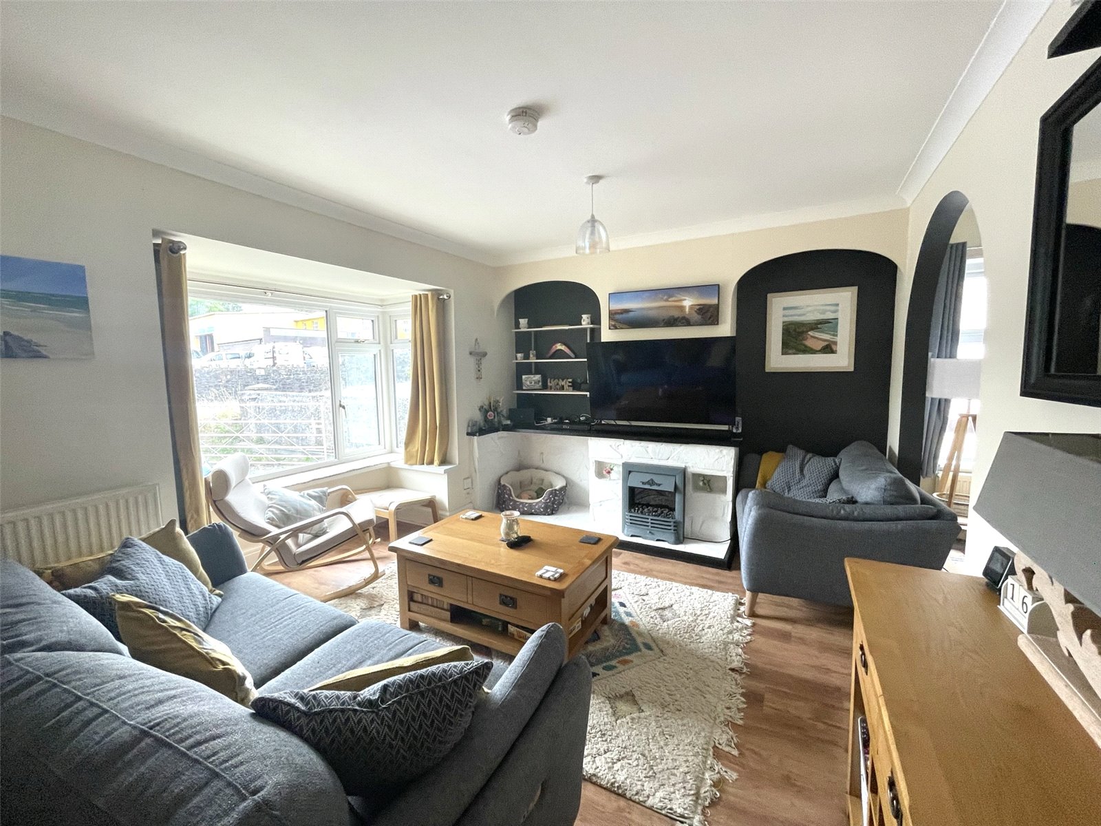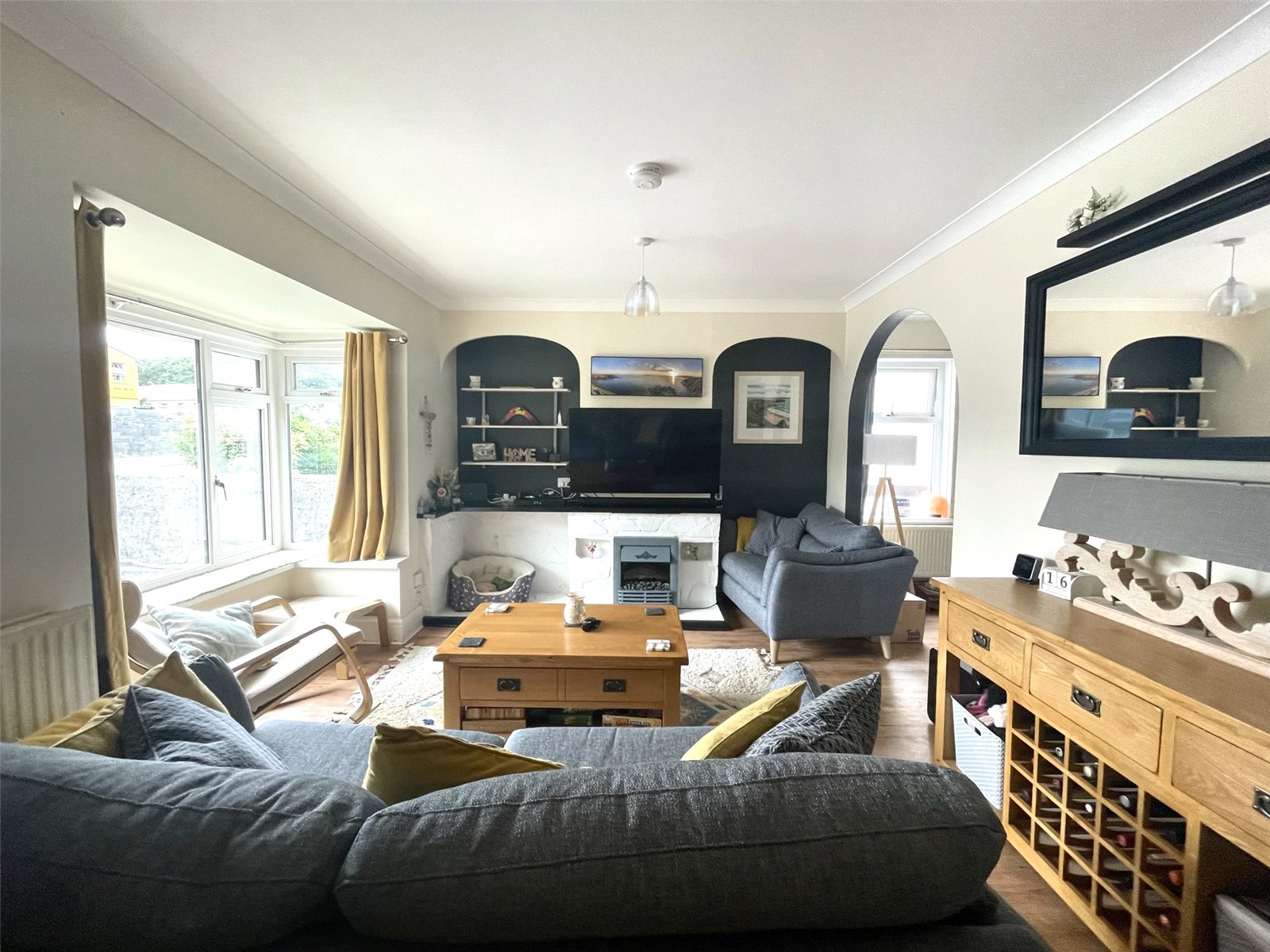 Laminate flooring, stone fireplace with electric fire, arched storage either side of the chimney breast, large uPVC double glazed bay window to front, 2 ceiling lights, radiator, arch leading to: