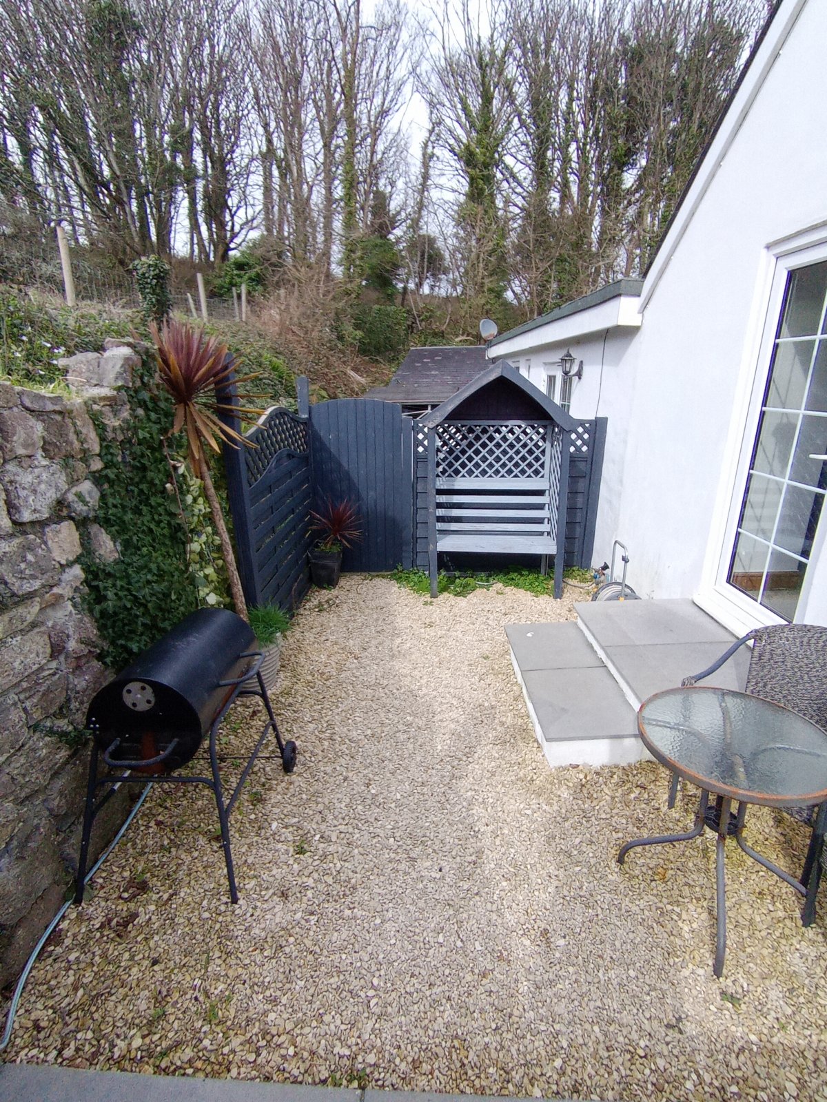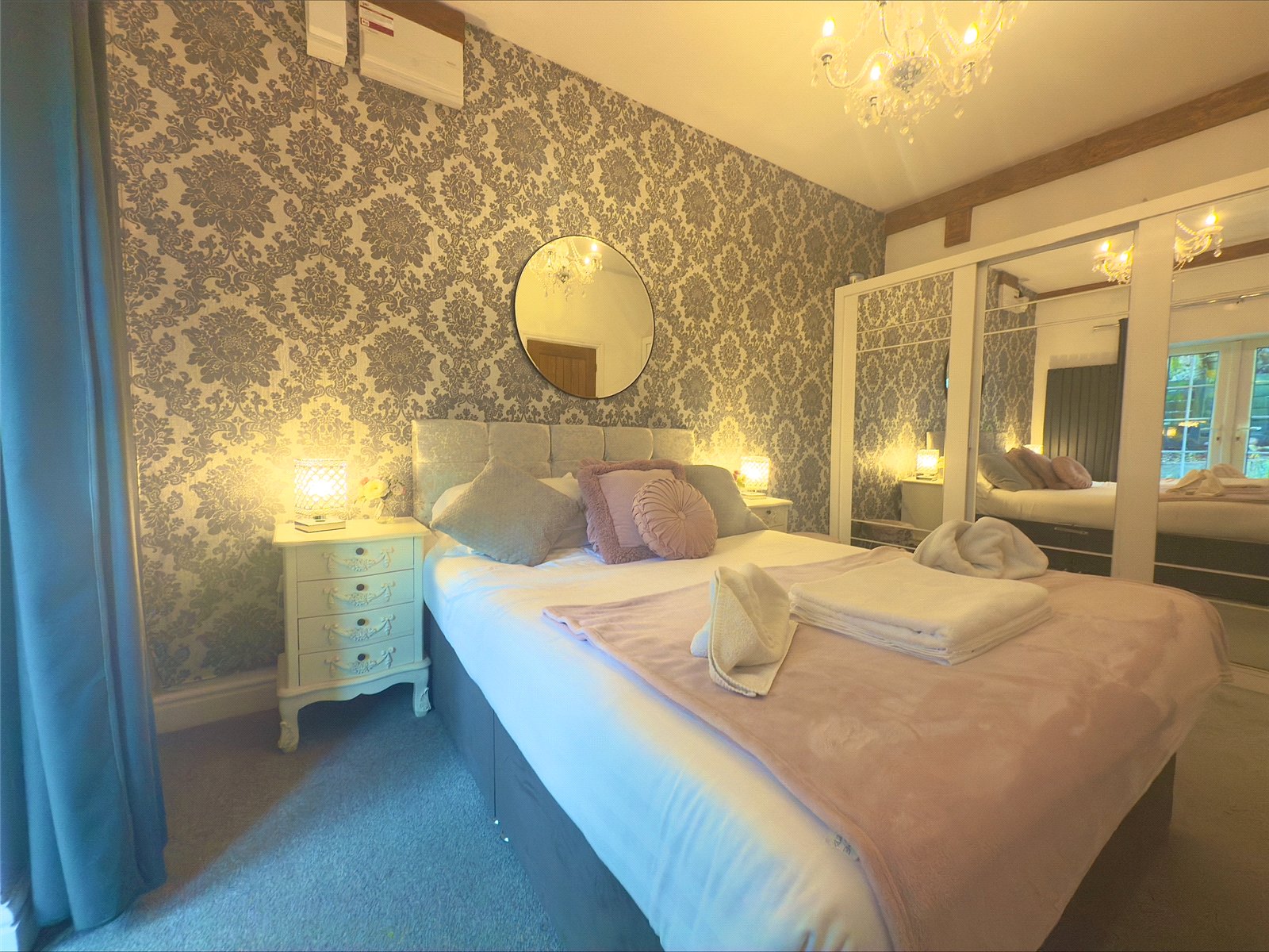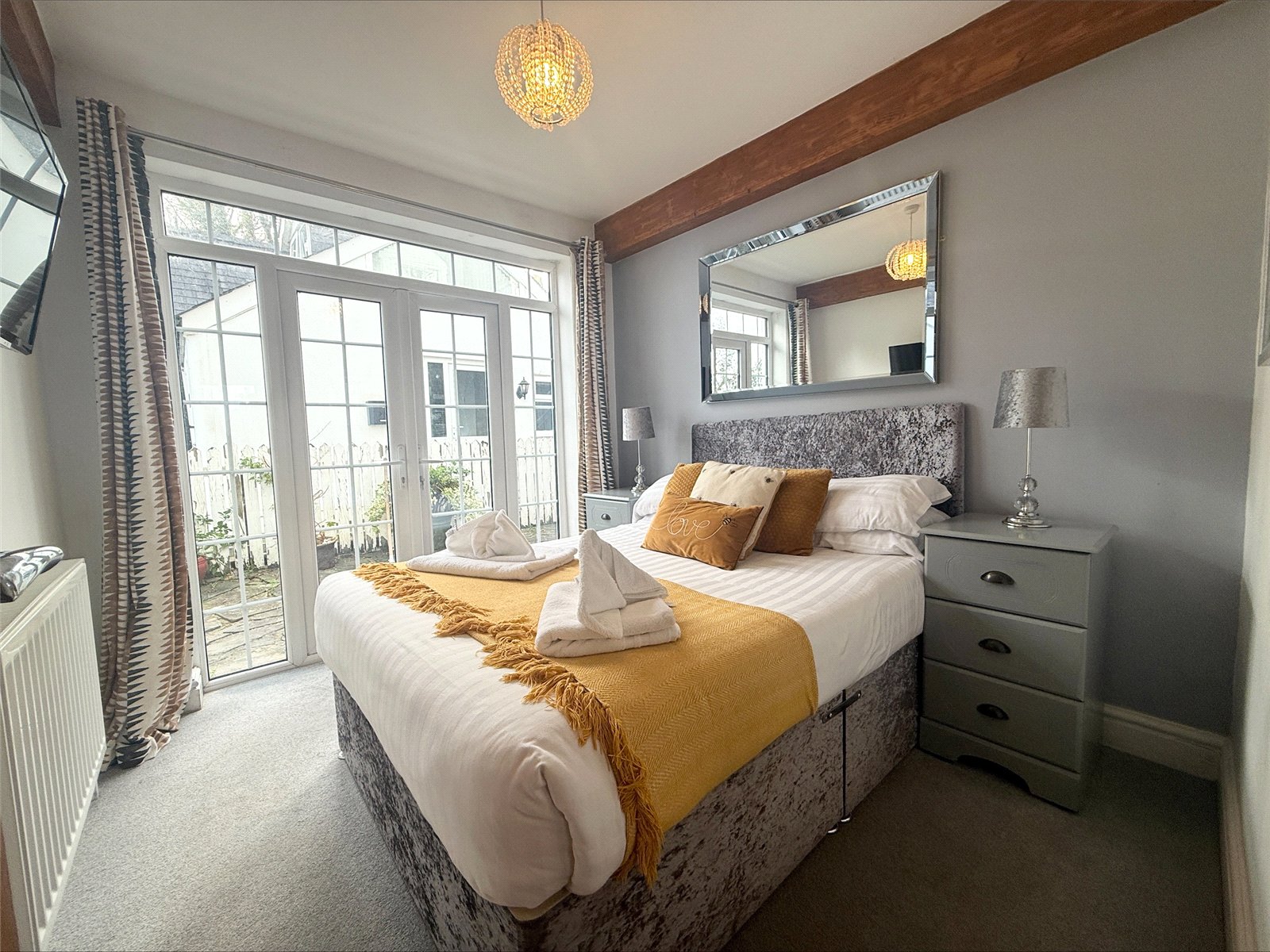 Double bedroom with UPVC patio doors leading to an outside seating area. Light fitting, carpet throughout, radiator, TV & electric points.