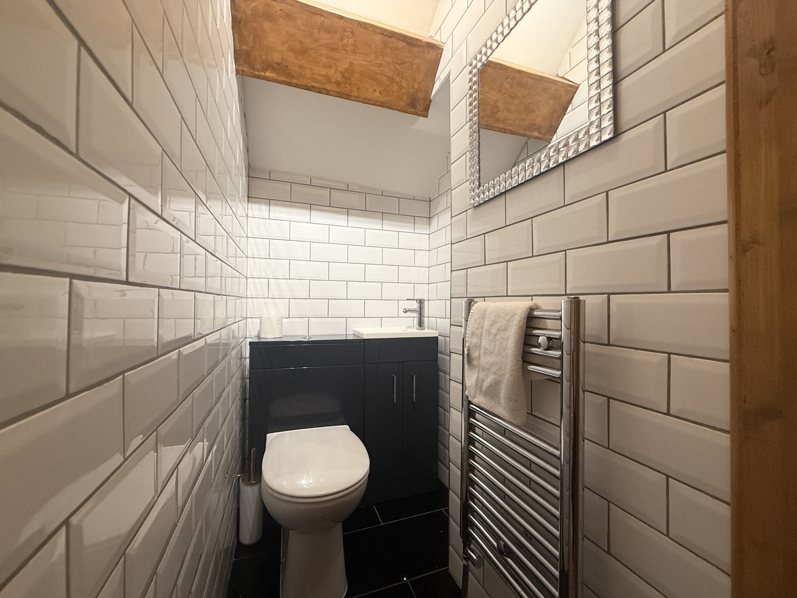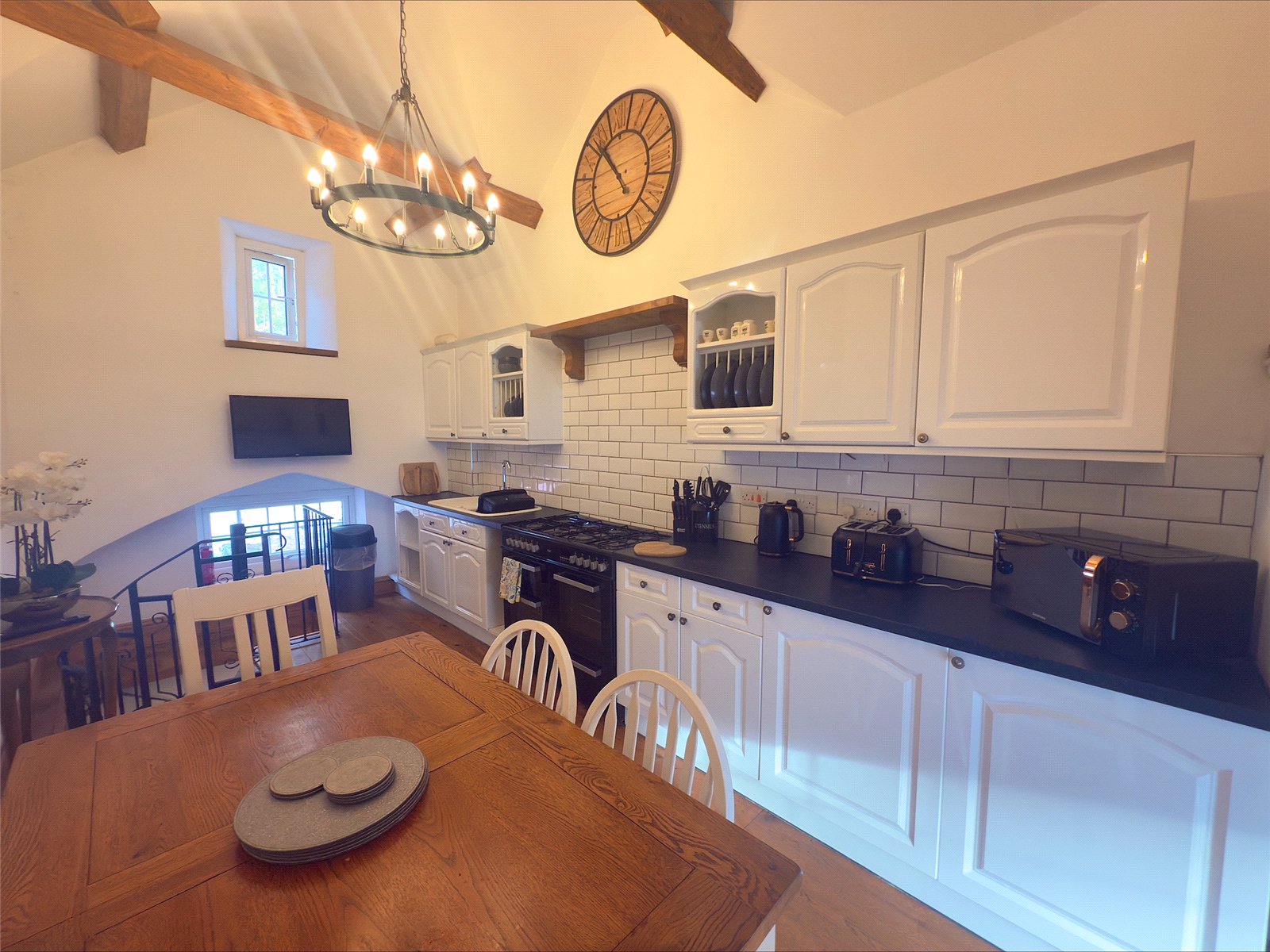 From the ground floor a spiral staircase takes you to the first level & into the dining and kitchen area which is light and spacious. Fitted wall & base units, integrated appliances, large rang style cooker, revealed beams, central light fitting and low-level window.