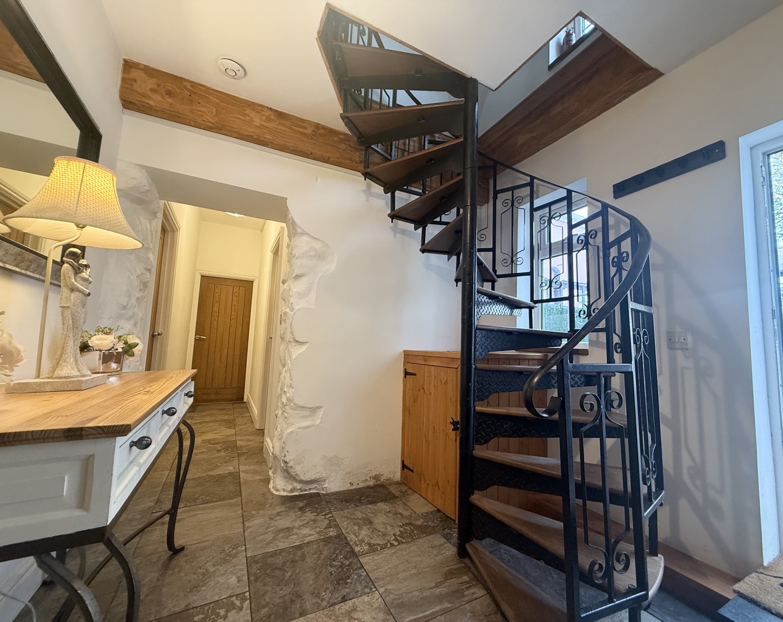 UPVC door leading into a lovely welcoming hallway which leads to all rooms on the ground floor. Tiled floor, light fittings, radiator, spiral staircase leading to the first floor.