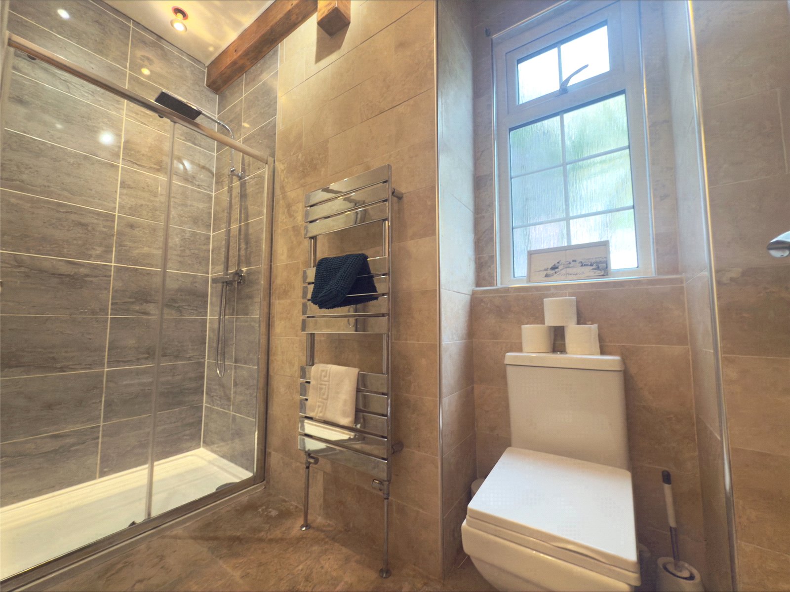 Lovely modern shower room with WC and wash hand basin, tiled walls and floor, light fitting walk-in shower.