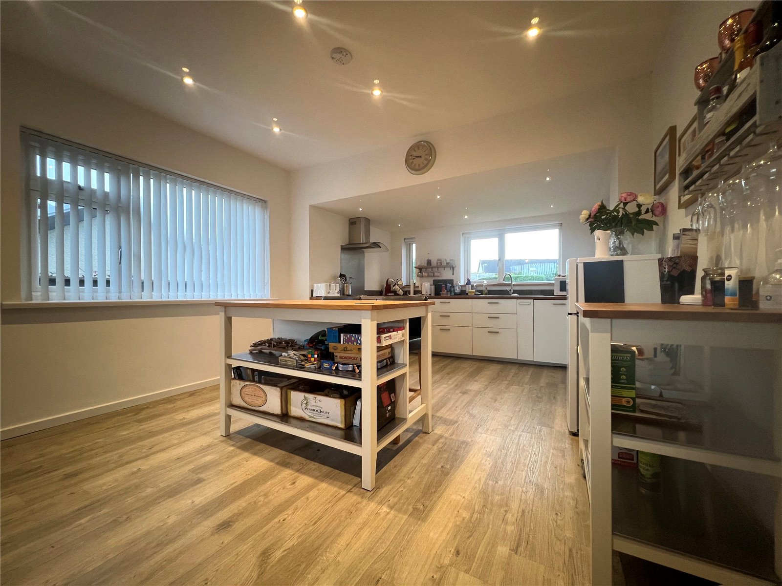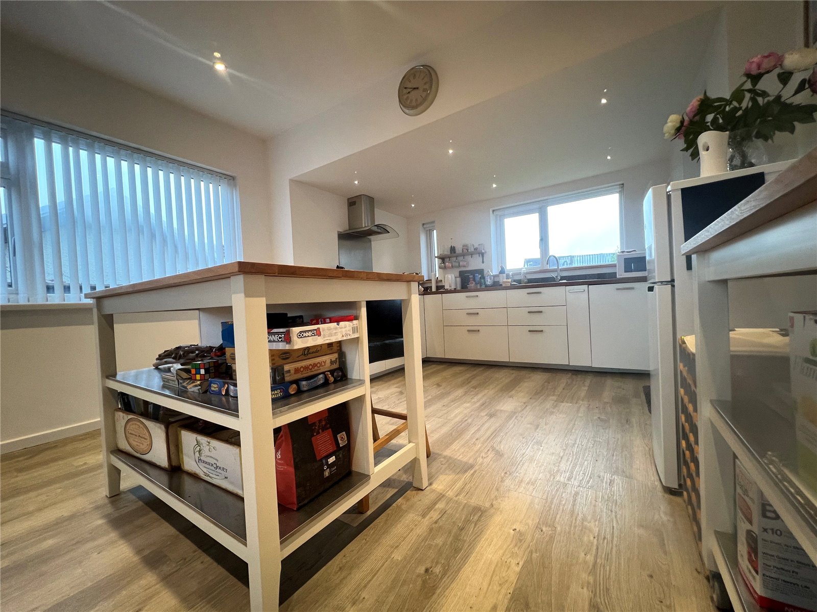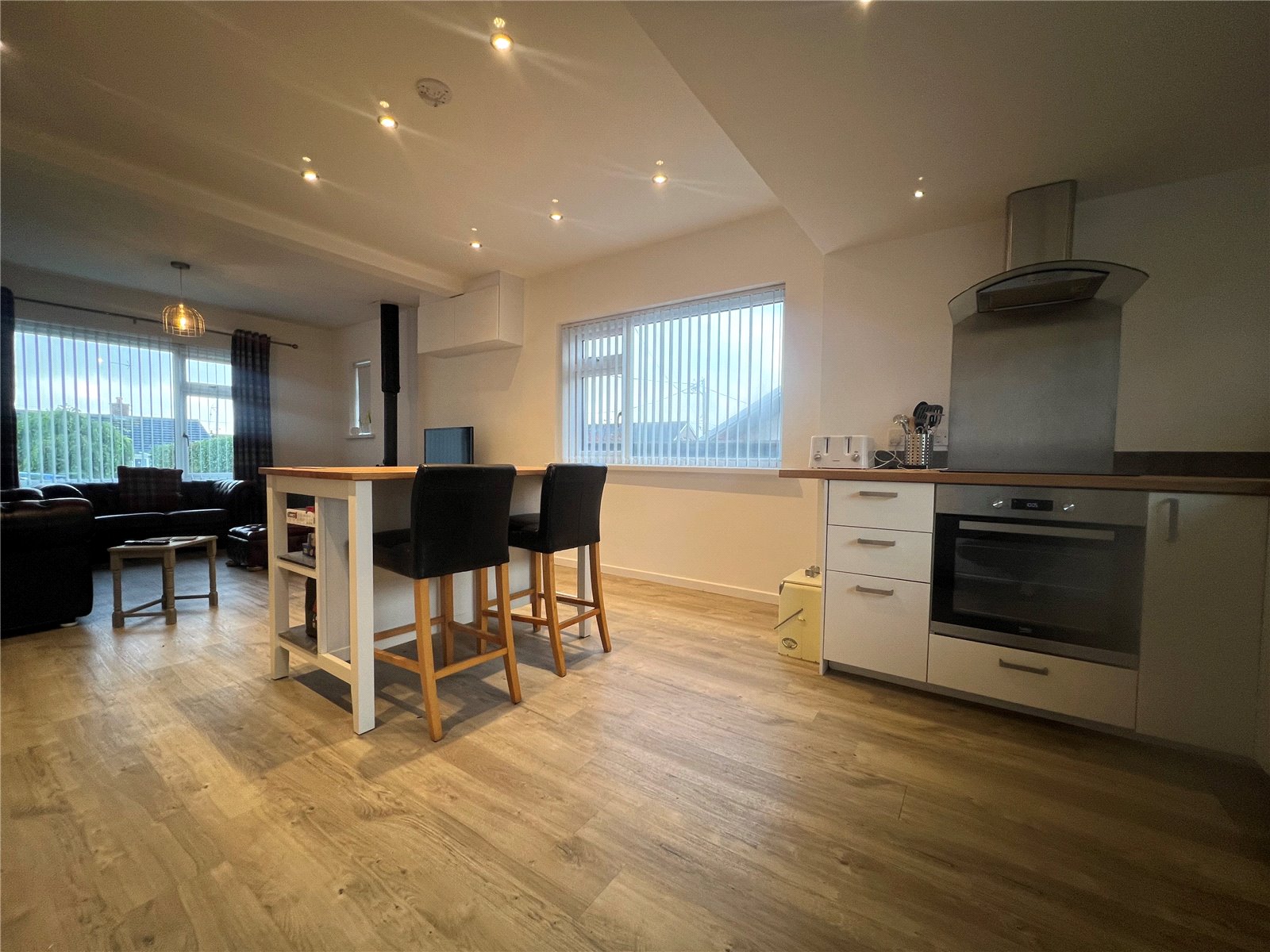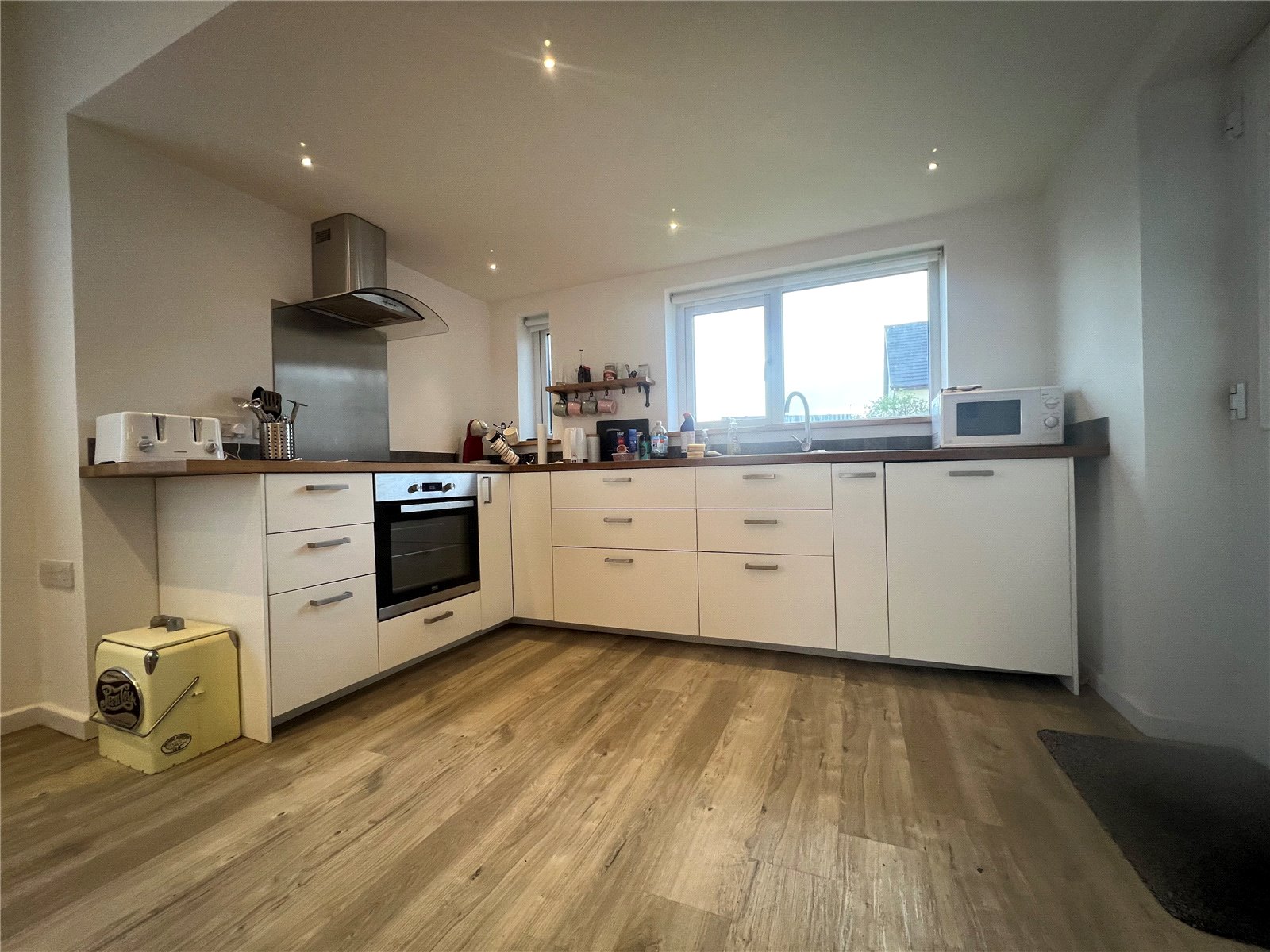 Modern fitted integrated kitchen with windows facing the rear garden. Fitted oven & hob, extractor hood, dishwaher, base & eye level units with work space.