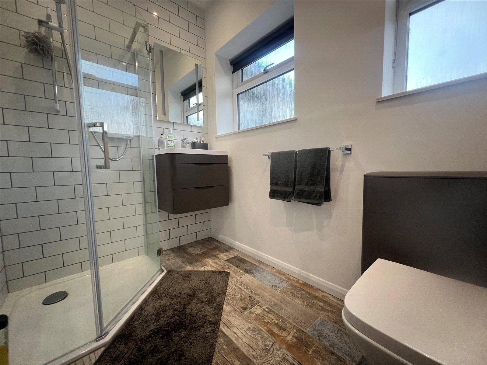 Modern fitted shower room with walk in shower cubicle, wash hand basin, W.C. heated towel rail.