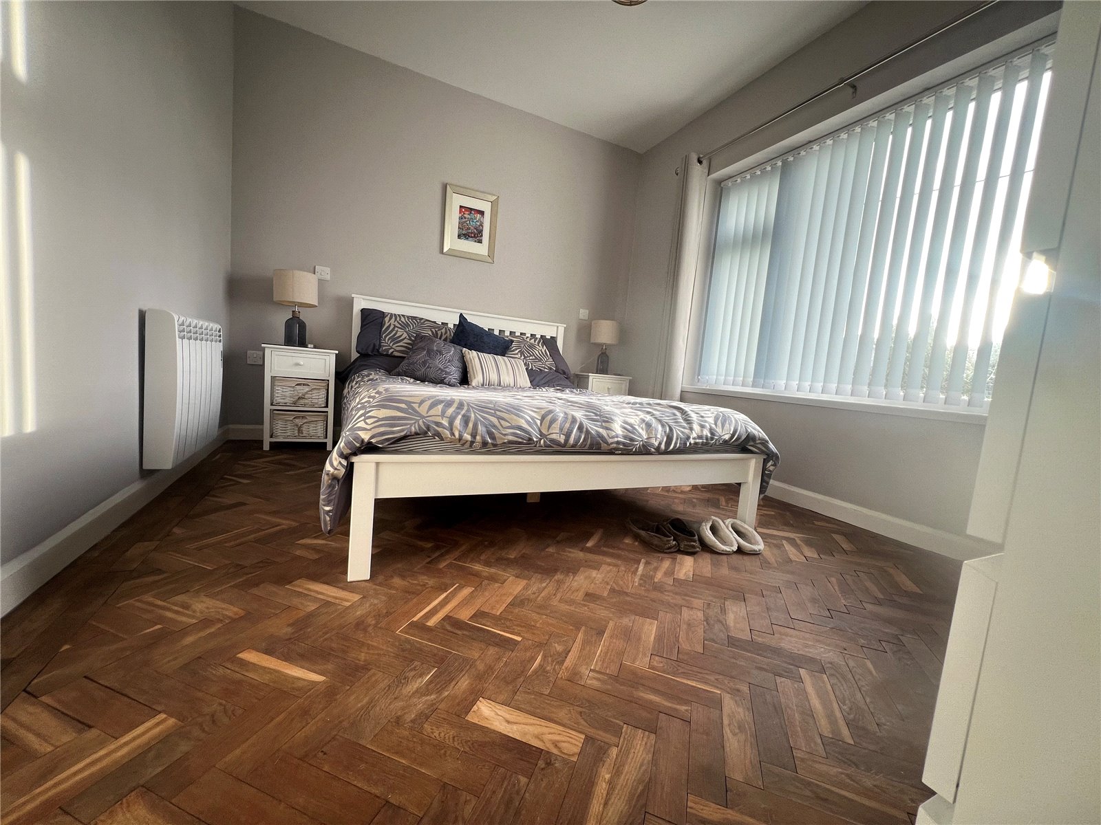 Main L shaped hallway leading to all rooms, loft access, modern electric panel heater.